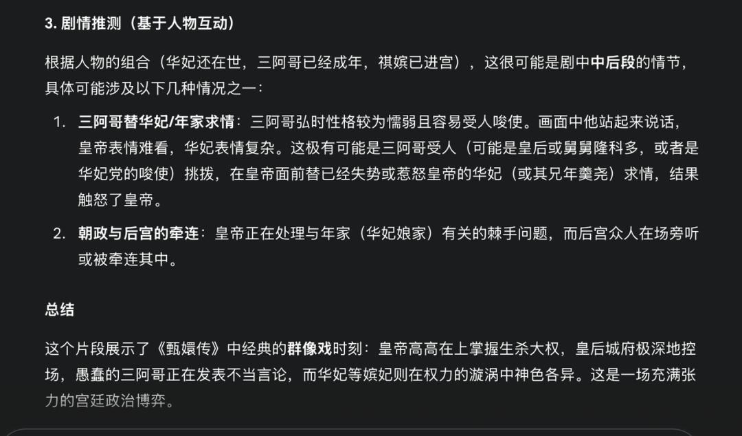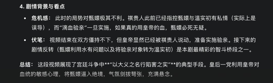 只是看到分析的最后一句话,知危才意识到,Gemini 3 分明知道后面的剧情进展,毕竟 Gemini 3 的训练数据已经包含了《 甄嬛传 》的各种视频、文本资料,能分析到这个程度或许并不令人意外。