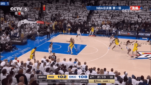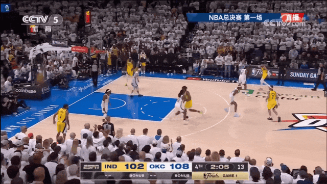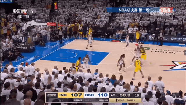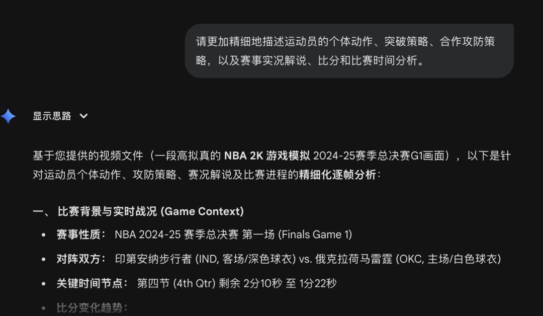 在第一次的简单分析中,Gemini 3 的回答表明了它认为这场比赛不存在,它甚至认为这是 NBA 2K 游戏的模拟画面。当然,它准确地认出了这是 NBA 雷霆 vs 步行者的总决赛,以及一开始的赛况。