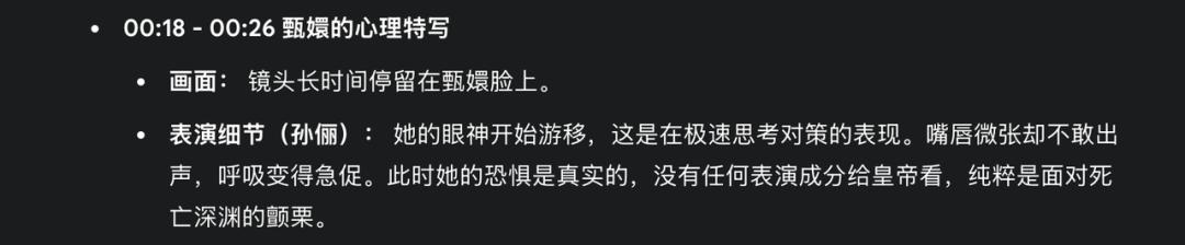 台词和潜台词都很精准,但最能展示多模态能力的,是对微表情的捕捉。比如皇后引导皇帝实施滴血验亲时,Gemini 3 描述皇后的表情动作为 “ 身体微微前倾,语重心长,眉头微蹙,眼神看似诚恳,实则紧盯着皇帝的反应 ”,大家可以看看对不对。
