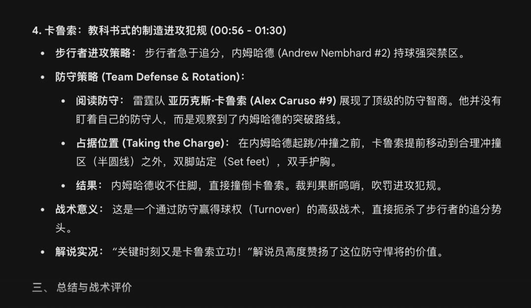 之后对第二回合、第三回合攻防的分析,Gemini 3 的描述都是准确无误的,除了内史密斯的 “ 犹豫 ” 其实指的是在 “ 上篮 ” 和 “ 投篮 ” 之间的犹豫,而不是上篮之前要不要减速的犹豫。