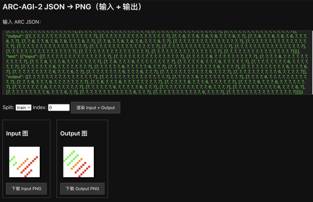 ARC-AGI-2 的官方发布使用 json 表示二维网格,例如下图是该项目的 GitHub 中包含的一个评测集中的数据部分展示: