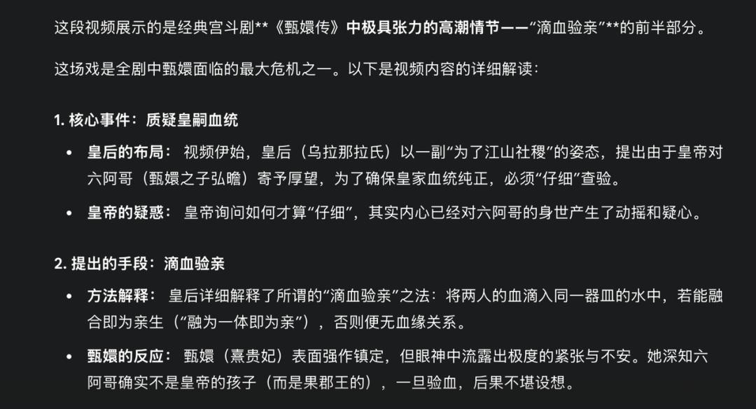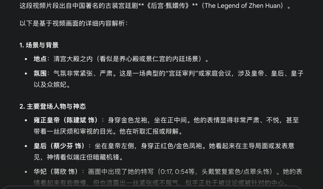 而且,台词语音其实是很好的对齐模态,台词能提供精准的语义提示,并和视频时间线做对齐,假设已经有大量文本语料给《 甄嬛传 》做了逐帧分析,那 Gemini 3 可能很大程度上不是基于视频来理解的。