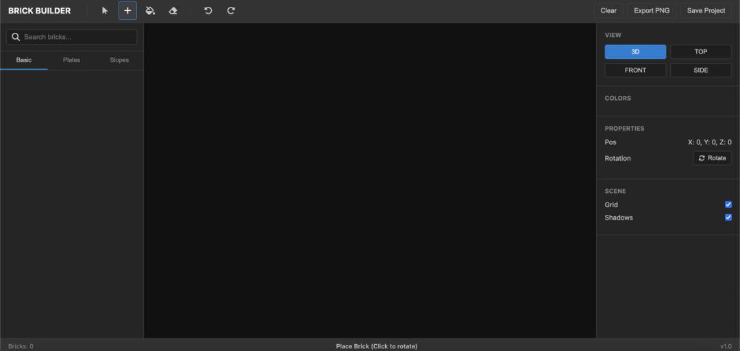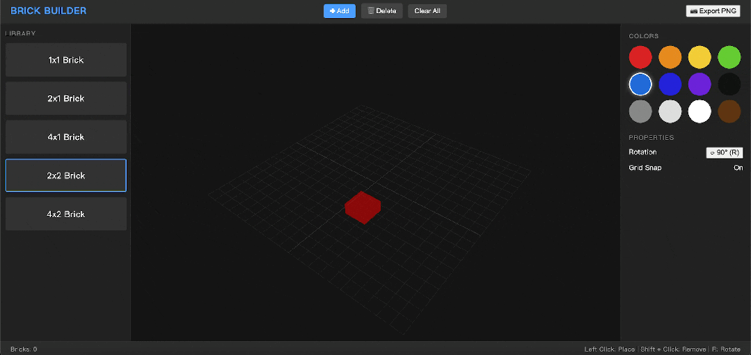 基于Three.js、html技术,构建一款名为 "BRICK BUILDER" 的3D乐高积木构建软件。