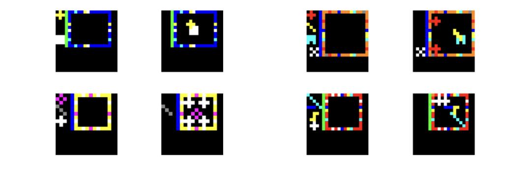下图是准确答案,方框的四条边上如果有某个颜色构成十字相对方位,该颜色对应的方框外几何素材就可以放入方框内十字交叉点的位置。这里因为微调了颜色,第四组的蓝色几何素材也要放入方框内。