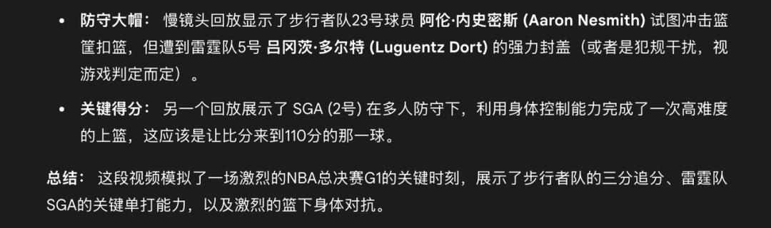 这一次,Gemini 3 的分析出现了很明显的错误或模糊不清的情况,比如( 00:16-00:55 )这一段,Gemini 3 描述 “ 视频出现剪辑跳跃 ”,但实际上在这段期间,雷霆和步行者先后进行了一次进攻未得分,最后雷霆的亚历山大凭借单打强攻得到两分。