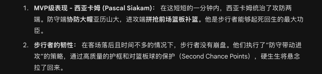 知危接下来还将后续比赛片段( 一直到步行者的 0 号球员哈利伯顿在最后时刻三分绝杀雷霆 )在同一个对话中传递给了 Gemini 3 继续分析,Gemini 3 结合实况解说语音还是能保持基本准确的水平,对步行者的 43 号球员西亚卡姆的高光时刻的分析很到位,并盛赞西亚卡姆给出了 MVP 级别的表现。