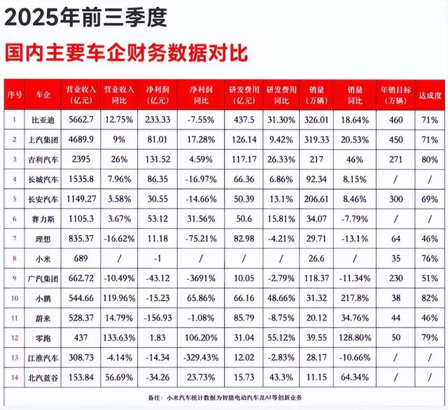 上一个数据,这是2025前三季度,14大上市车企的业绩情况,可以看到总营收高达2.07万亿元,增长很猛,但是利润只有364亿元,整体净利润率只有1.76%,创下新低。
