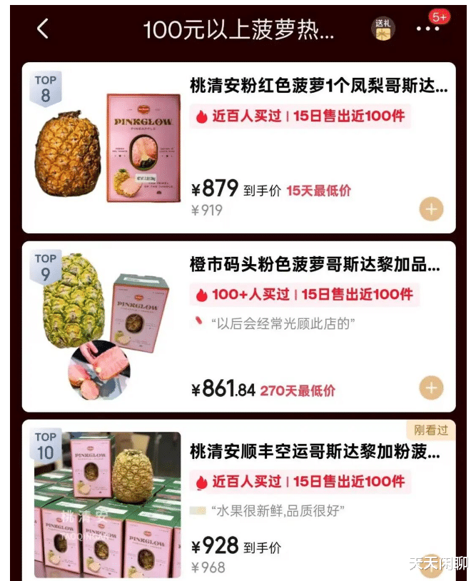 “哥斯达黎加粉菠萝”单颗售价近千元,仍跻身电商平台百元以上菠萝热卖榜前十,部分店铺半月销量近百件。几乎同时,“黑草莓”(真红美玲草莓)在电商平台上的“甄选大果”售价高达300多元一斤-7-10。