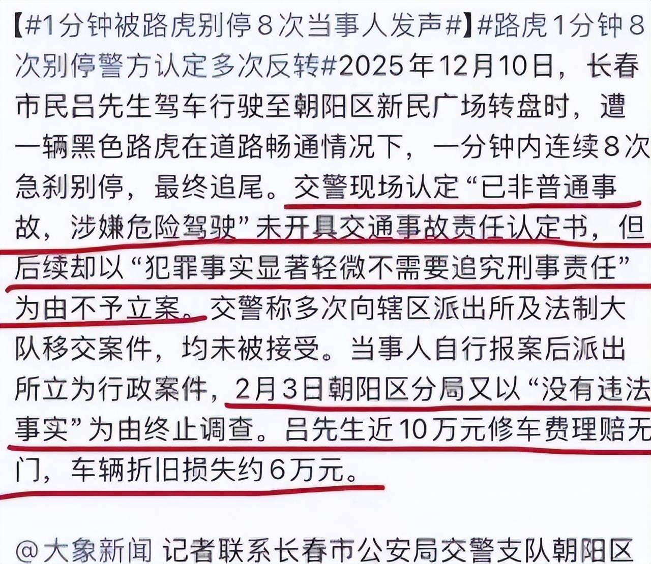 事发后,现场处置交警最初就认定该案超出普通交通事故范畴,涉嫌刑事犯罪,可后续维权过程中,案件处理接连发生反转,先是不予立案,之后多部门推诿不收,最后以无违法事实终止调查,结果一出立刻引发全网热议,不少网友共情车主遭遇,事件很快发酵成为全国关注的热点。
