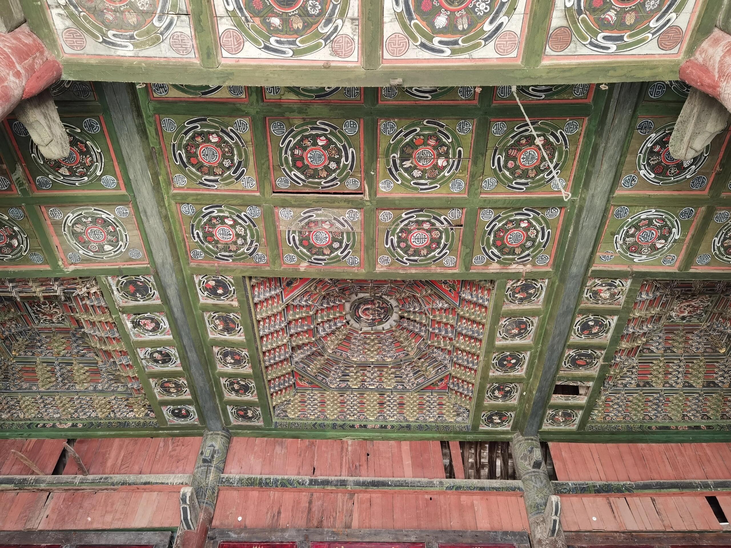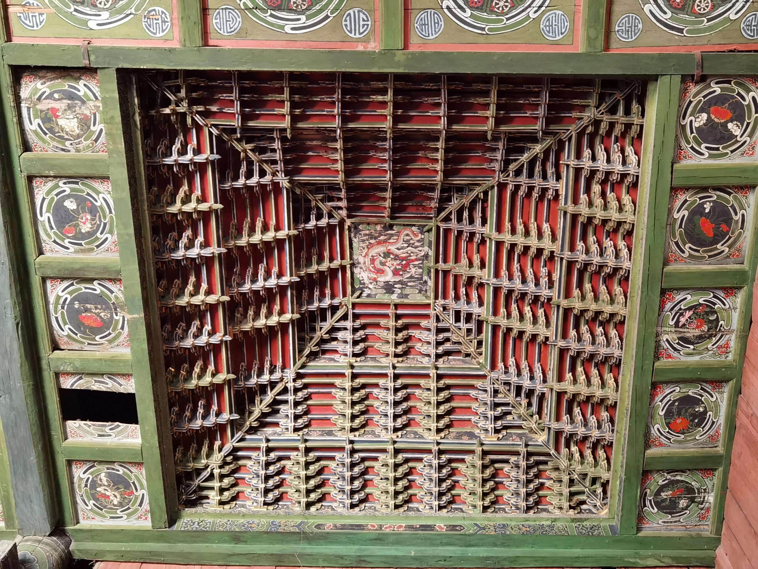 而最让人拍案叫绝的,当属大雄宝殿内的藻井。藻井位于大殿的中央,是一种向上隆起的穹顶式结构。灵岩寺的藻井采用斗八藻井的形式,由下而上分为方井、八角井和斗八三层。方井四角雕刻着精美的云纹,八角井的八个角上装饰着木雕的垂莲柱,柱头上雕刻着仰莲、宝相花等图案。最上层的斗八部分,由层层叠叠的斗拱组成,每一朵斗拱都雕刻得细致入微,组合在一起,形成了一个复杂而精美的图案。站在藻井下方抬头仰望,仿佛置身于一个神秘的空间,阳光透过藻井的缝隙洒下,光影交错间,更增添了几分神圣与庄严。