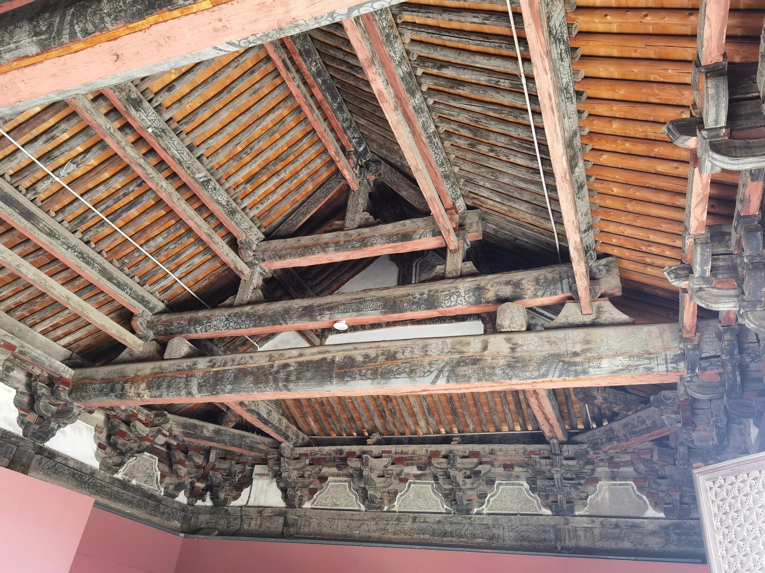 除了独特的屋顶和藻井,大雄宝殿的梁架结构也十分讲究。殿内采用减柱造的做法,减去了部分金柱,使得内部空间更加宽敞,为举行宗教仪式和信徒参拜提供了充足的空间。梁架上的驼峰、蜀柱、叉手等构件,用材硕大,造型简洁,既保证了建筑的稳固性,又体现了明代建筑注重实用与美观相结合的特点。