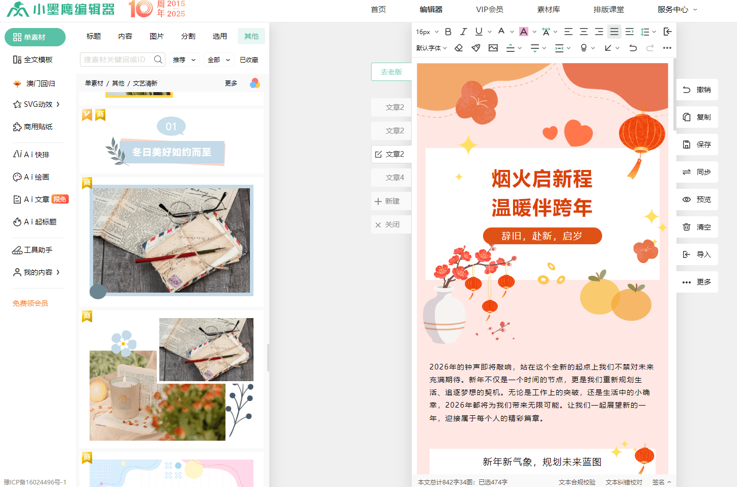 所以说,你的排版风格,就藏在你对素材库的一次次选择里。小墨鹰这类编辑器的价值,就是把各种成熟的设计风格拆解成一个个素材零件,供你自由组装。多去它的素材库里按关键词搜索、浏览,你的审美和风格感,会在这个过程中快速成长起来。