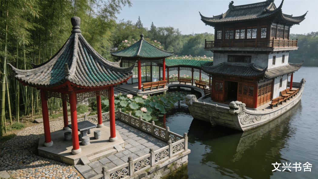 舫:形似船的建筑,停泊在池中,虽不能远航,却承载着主人 “浮舟沧海” 的向往。