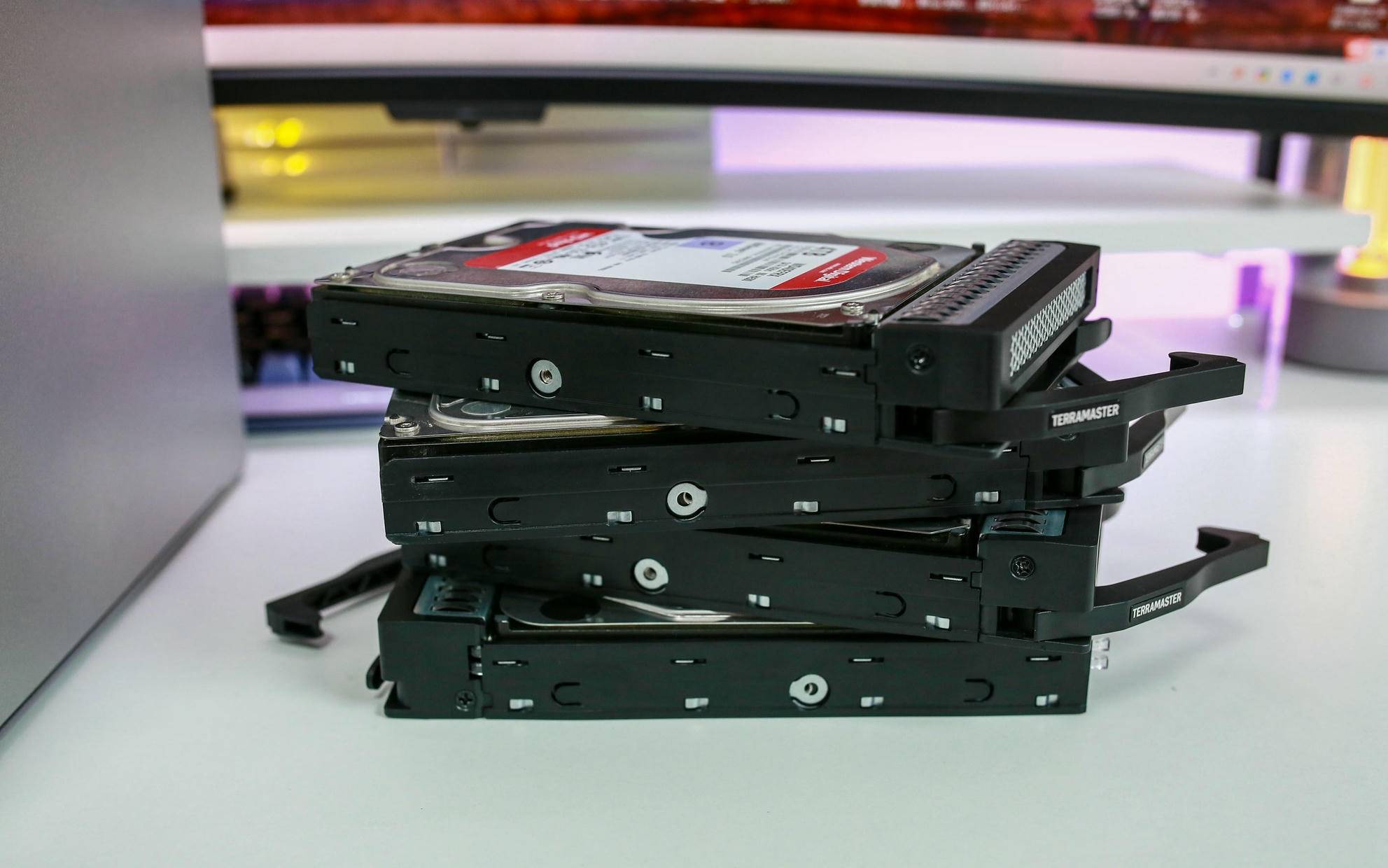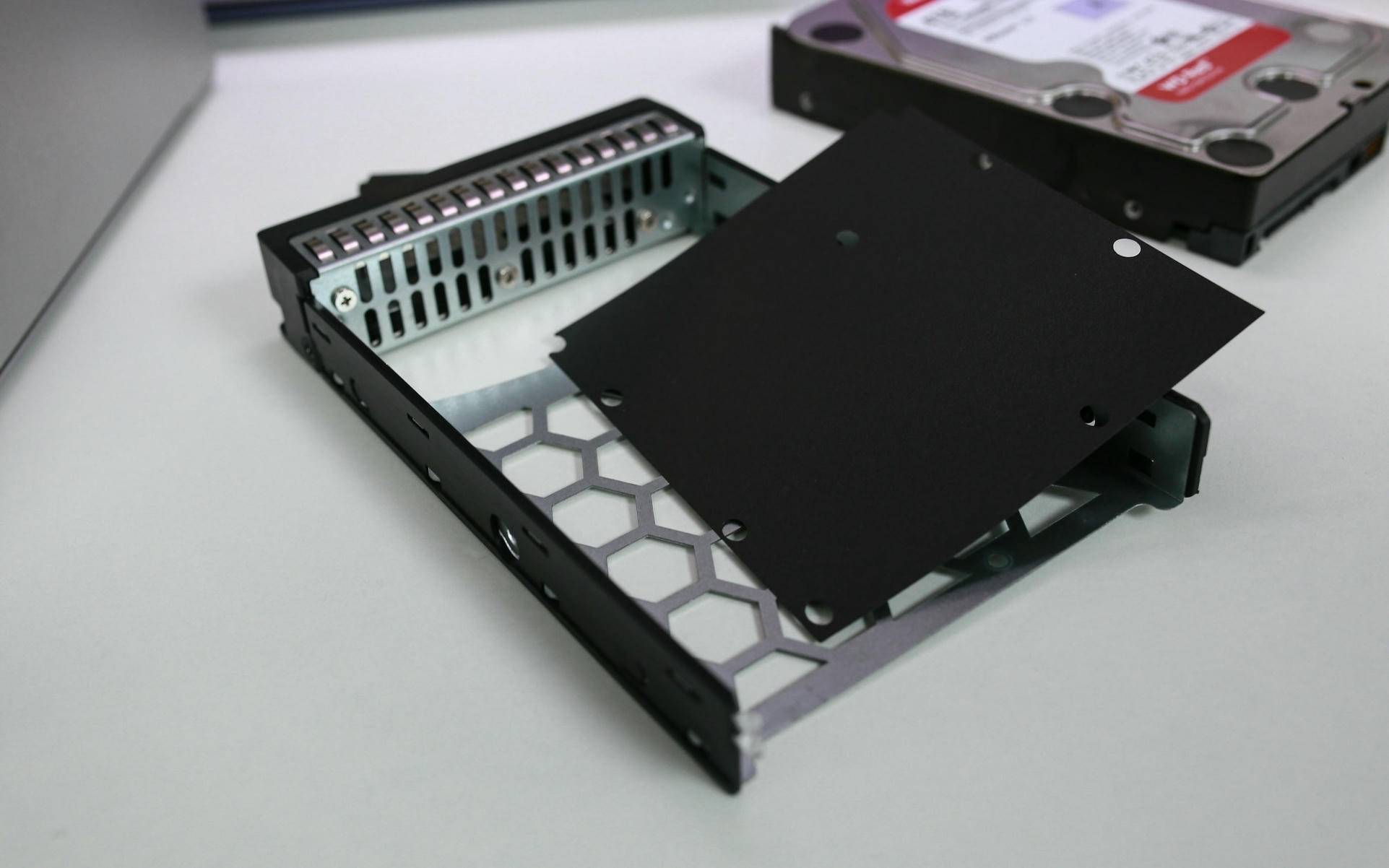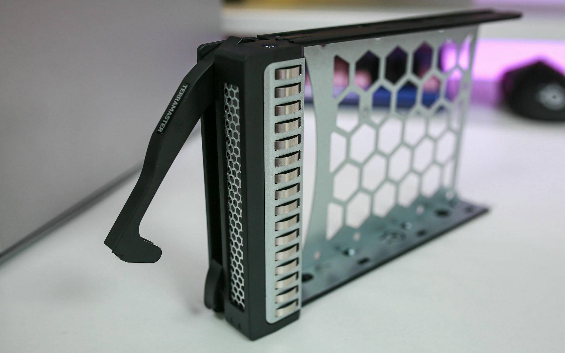 硬盘安装过程也十分便捷,只需将硬盘按照标记位置对准卡入,然后在侧面拧上两颗螺丝,就能将硬盘牢牢固定在硬盘架中,既不松动也不生硬。整个装配过程非常顺手,新手用户也能快速完成装配。