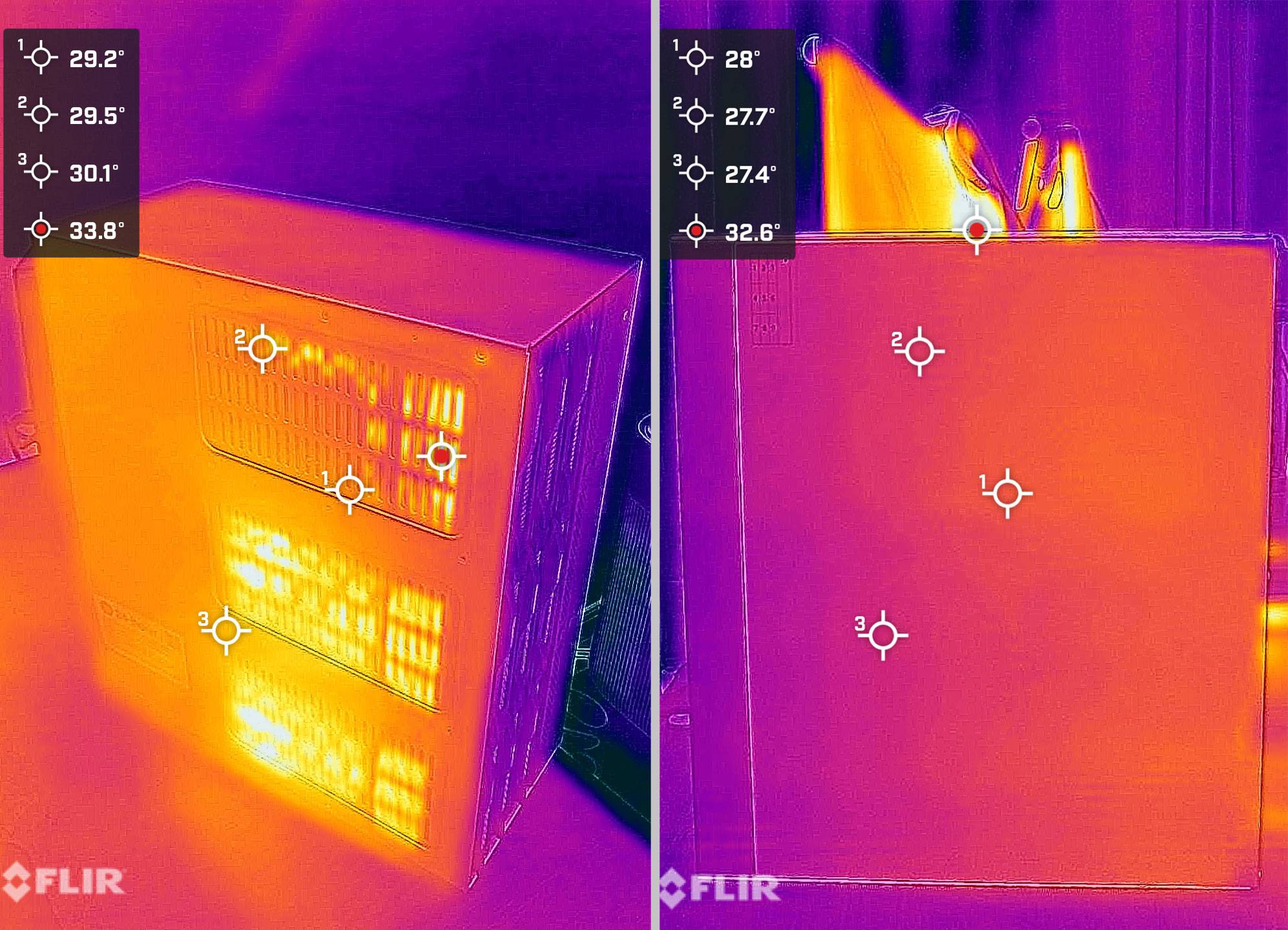 两个侧面温度则分别为 33.8℃ 和约 30℃,说明其风道设计科学合理,内部气流流通顺畅,有效带走热量,为硬盘长期高负载运行提供了可靠保障。