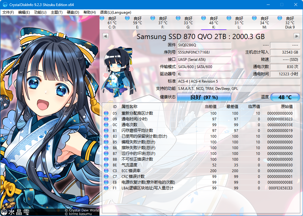 在铁威马 D9-320 磁盘阵列柜中测试 Samsung SSD 870 QVO 2TB 固态硬盘,系统识别正常,显示容量为 2000.3 GB,接口为 UASP(Serial ATA),支持的标准为 ACS-2 和 ACS-3 Revision 3b,说明这块硬盘在兼容性和接口协议上完全没有问题,能够稳定发挥出 SATA3.0 的带宽潜力。
