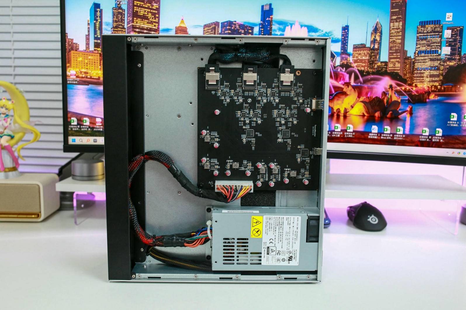 打开铁威马 D9-320 的侧盖后,可以清晰地看到内部的主板和电源布局。主板采用黑色PCB板设计,整体做工扎实,布局紧凑而有条理。作为一款9盘位的磁盘阵列柜,主板承担了数据传输和供电控制等关键任务,因此稳定性和用料都至关重要。