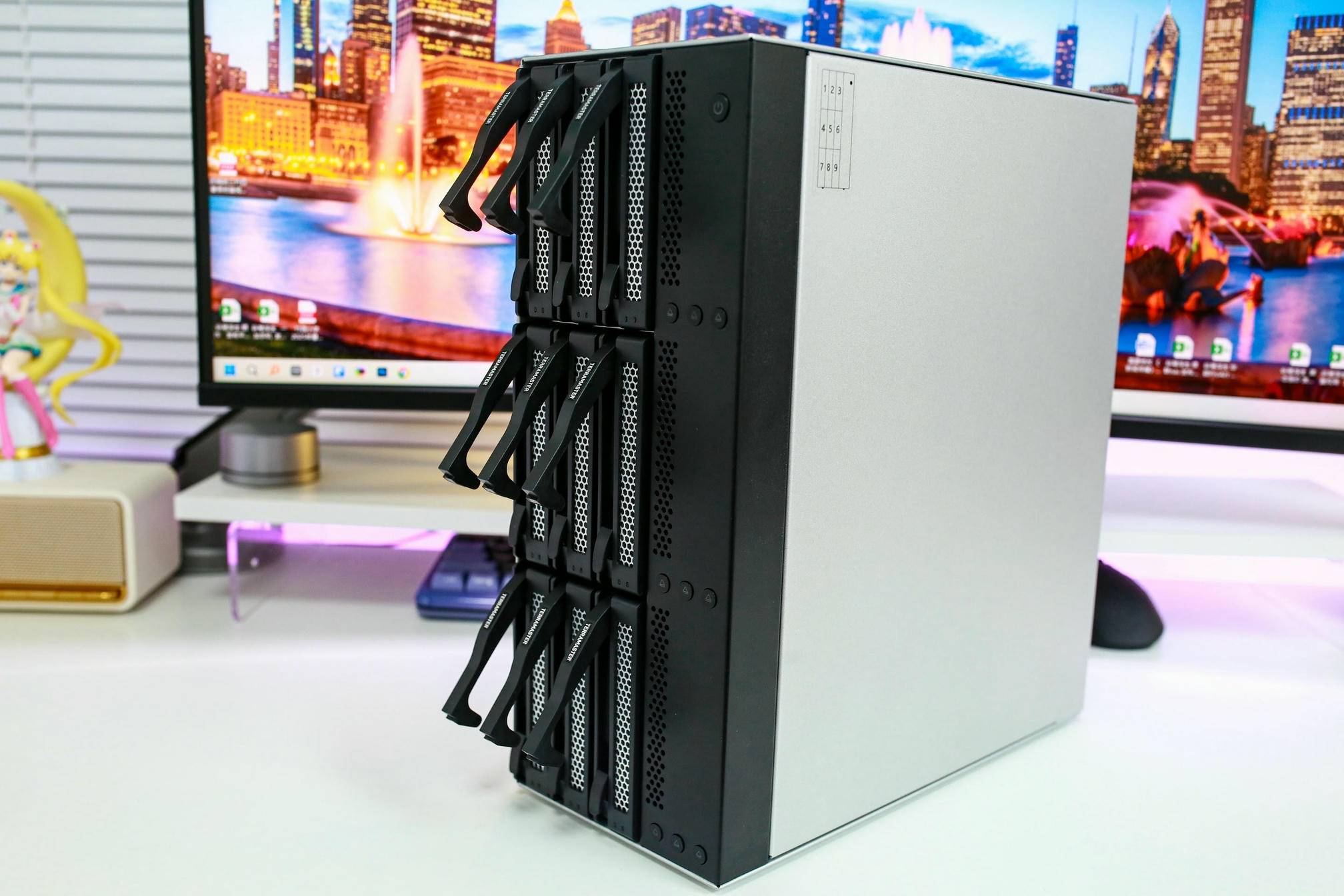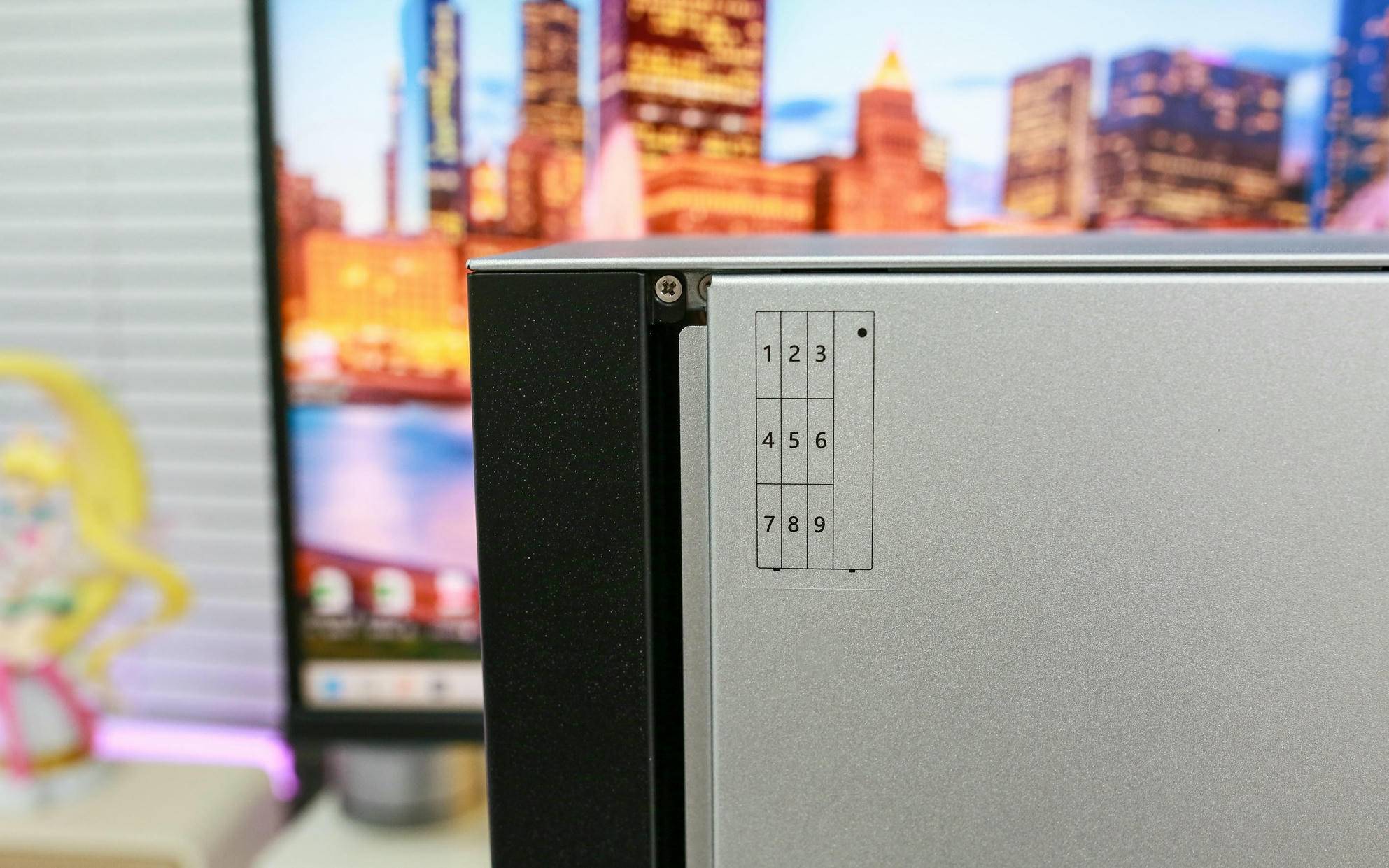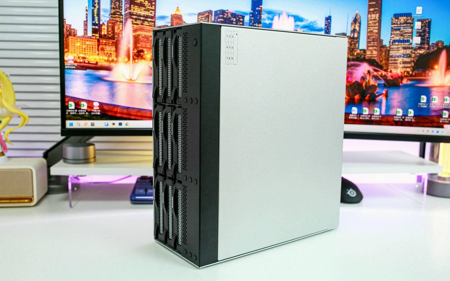 右侧面板则偏向于实用性设计,采用银白色配色,与正面的深色形成反差用料非常扎实,整机重量达6.4kg。机箱侧标注了九个硬盘位的编号,对应正面插槽的排列,用户在更换或维护硬盘时能迅速定位,大幅提升操作效率。