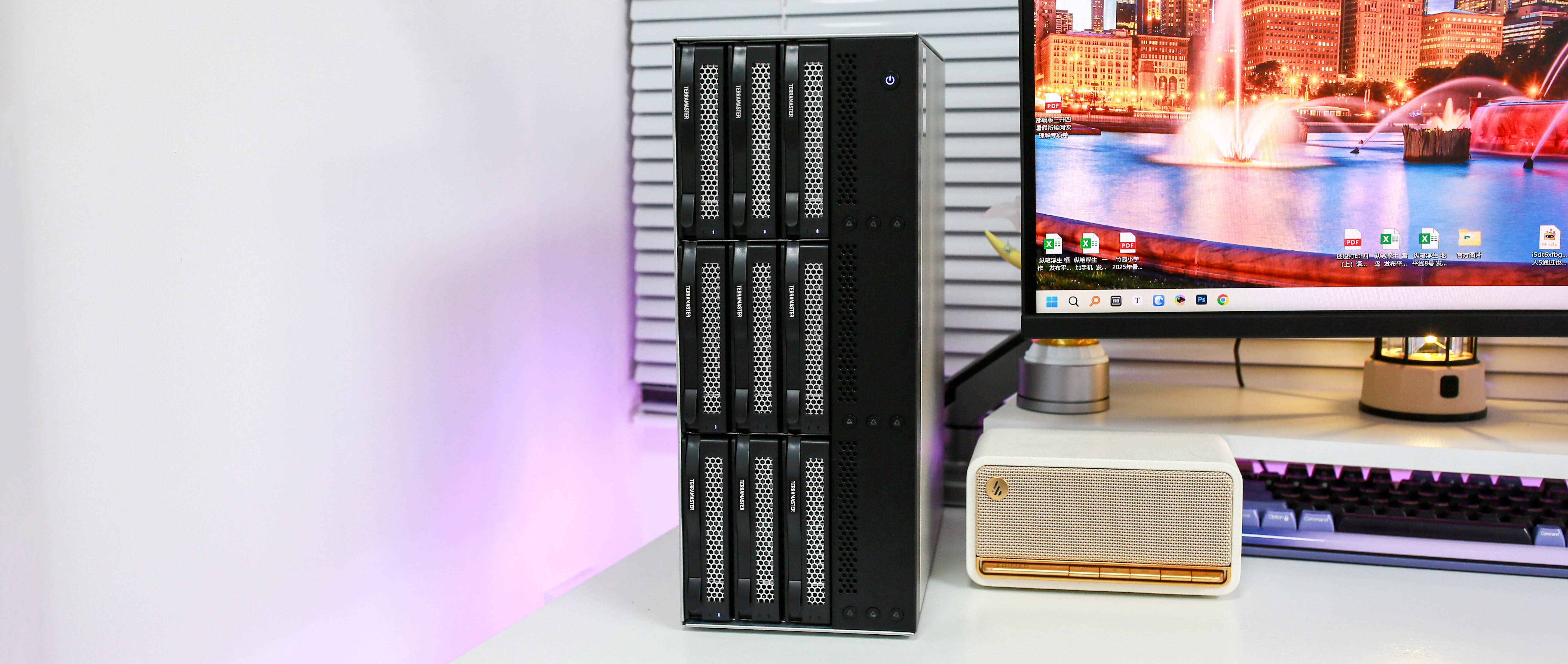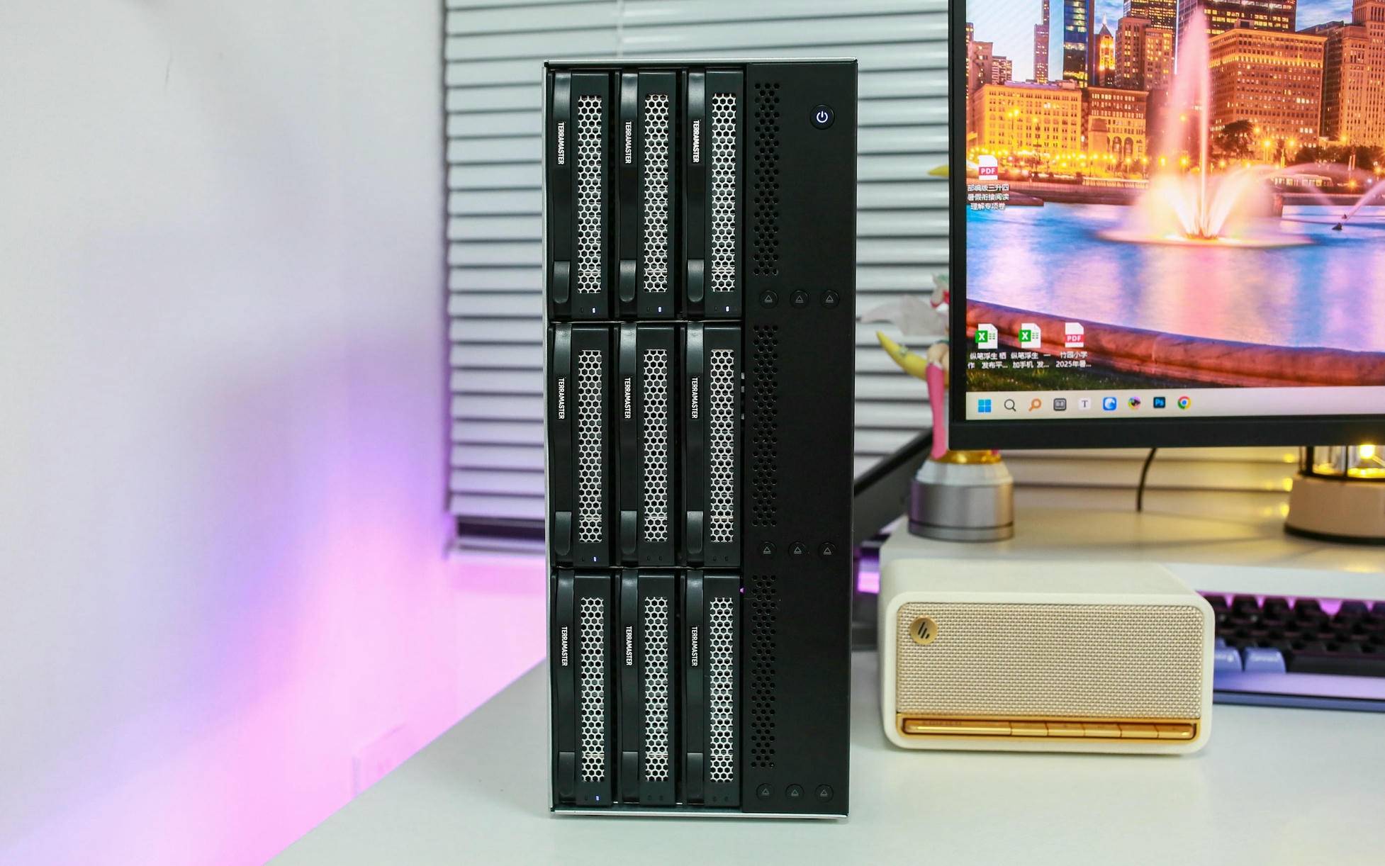 铁威马 D9-320 磁盘阵列柜凭借其全金属机身、简洁大气的设计以及出色的硬件用料,为用户提供了专业级的数据存储与管理体验。其九盘位横向抽屉式硬盘笼设计兼容 3.5 寸与 2.5 寸 HDD/SSD,配合稳固的缓冲簧片、绝缘纸以及背部高效风扇,确保在高强度读写场景下依然保持稳定运行和良好散热。同时,其静音表现出色,几乎不影响日常办公或居家环境。机身侧板与硬盘槽的镂空设计进一步提升通风效率,强化整体温控性能。