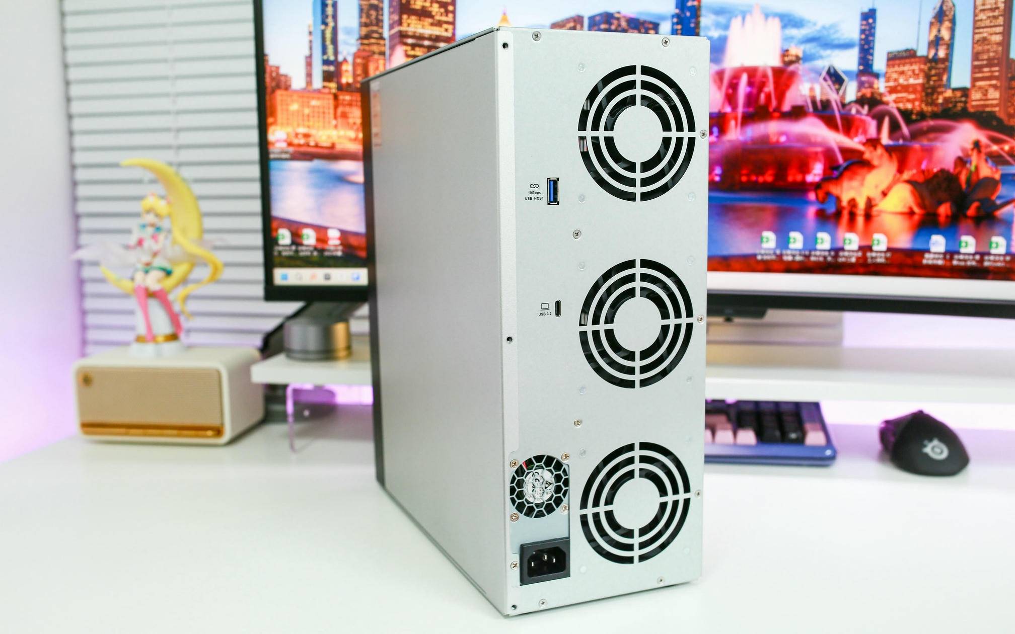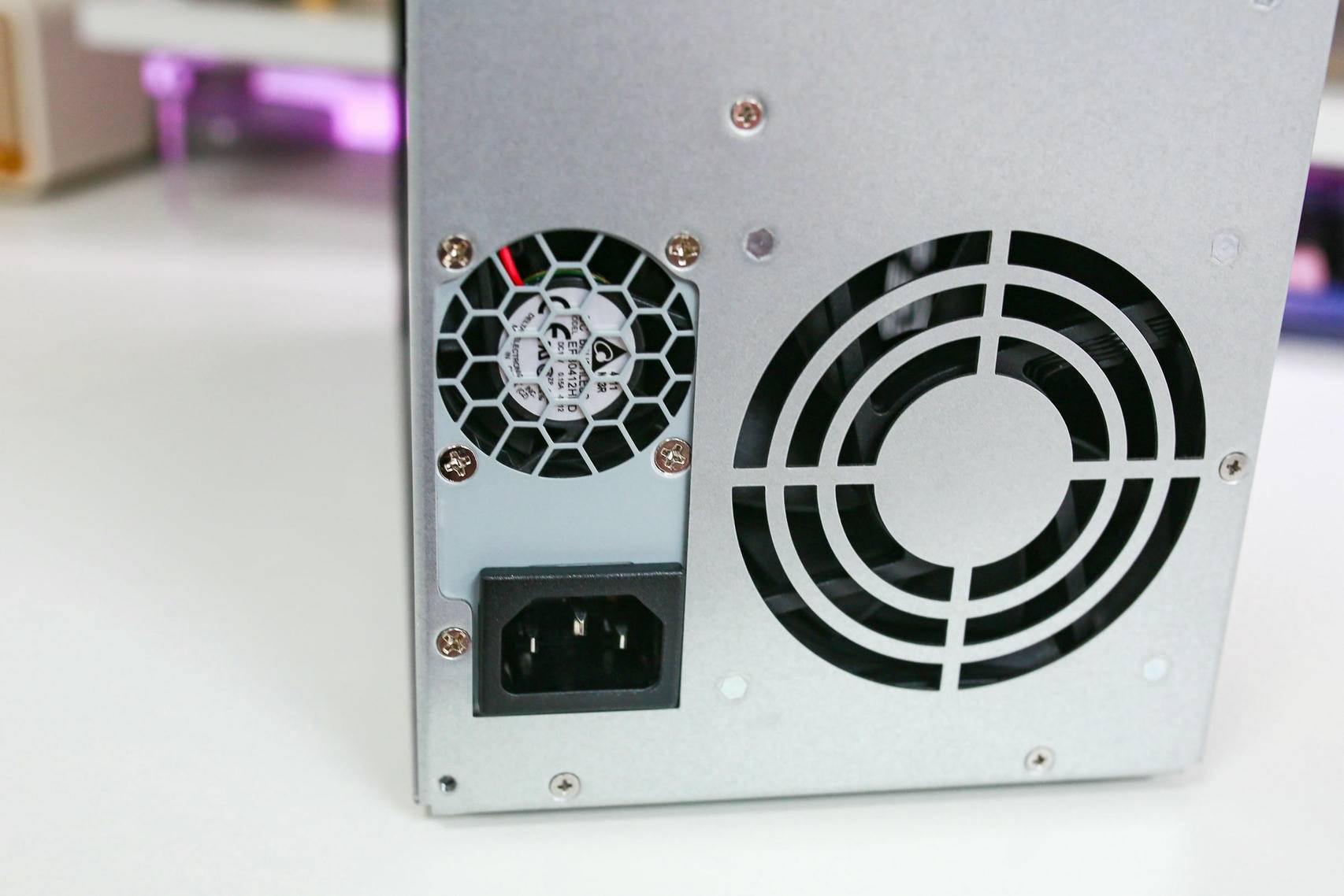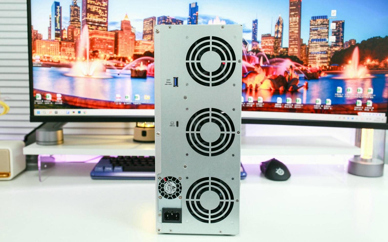 来到铁威马 D9-320 的背面,最显眼的就是那三个大尺寸的静音风扇和一个电源风扇,几乎占据了整个背部三分之二的面积。这样的设计不仅在视觉上给人强烈的散热信心,也确实在实测中提供了出色的散热效率,保障硬盘在高负载运行时保持稳定温度。至于接口方面,则走了简洁实用路线,仅配备了一个 USB host 接口,以及一个支持 10Gbps 传输速度的 USB3.2 Gen2 Type-C 接口,满足日常高速数据传输需求。