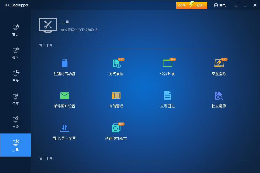 除了核心功能,TPC Backupper 还内置了诸多实用工具,包括创建可启动盘、进入恢复环境、擦除硬盘数据、镜像完整性校验及存储管理等模块。在系统崩溃无法启动时,可通过可启动盘恢复数据;而硬盘擦除功能则在数据清除时确保彻底无残留。整体来看,它与 D9-320 的组合,不仅是高效的数据备份解决方案,更是稳固的数据保护堡垒。