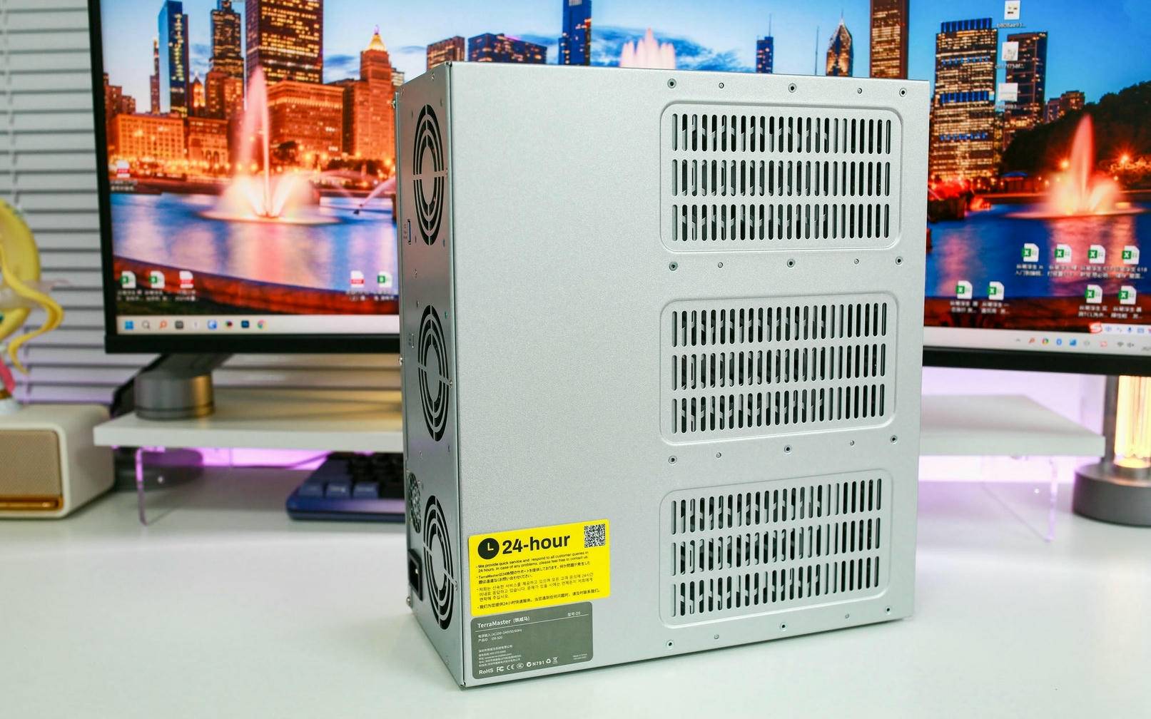 从细节来看,铁威马 D9-320 的每个硬盘槽都采用了镂空设计,有效提升硬盘间的空气流通效率。配合全金属机身与镂空侧板,整个箱体形成了优良的散热结构。在高性能运行时,尾部大型风扇还能持续将热量快速导出,形成从前至后的风道循环,使设备即便在长时间满载状态下依然保持良好温控,提升整体稳定性与硬盘寿命。