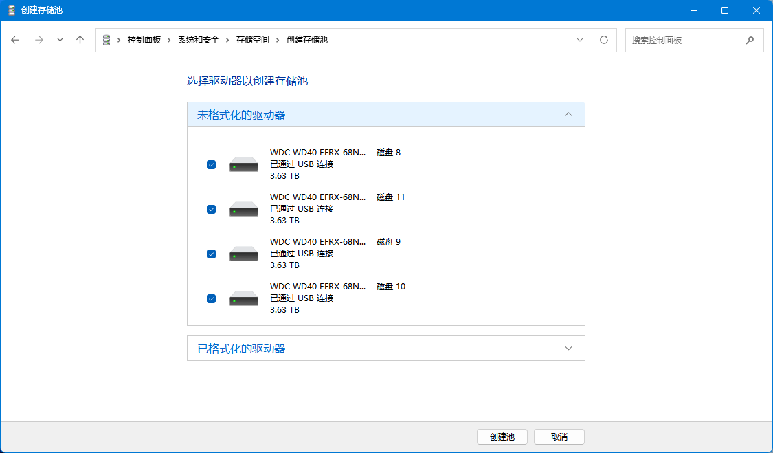 在铁威马 D9-320 中配置阵列模式时,如果不想借助第三方专业工具,直接使用 Windows 11 自带的“存储池”功能就是一个简单高效的选择。创建过程相对直观,打开存储空间设置界面后,只需勾选要加入阵列的硬盘,即可进入模式选择环节,无需繁复配置。