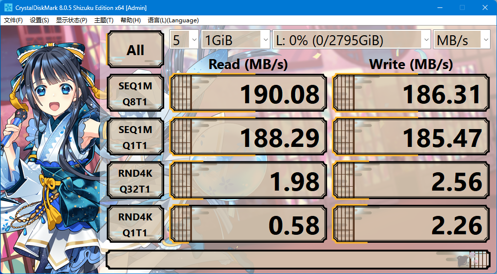 在单盘模式下进行速度测试,读取速度为 190.08MB/s,写入速度为 186.31MB/s,属于典型的机械硬盘高水准性能。这种稳定的传输速率对于日常的数据备份、文件共享以及长时间运行的存储需求来说非常合适,尤其适合以数据安全和持久存储为核心的使用场景。
