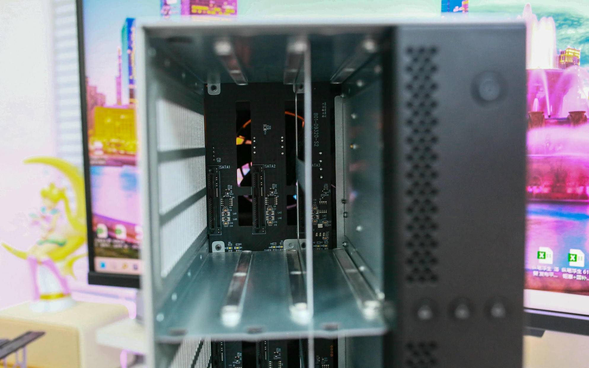 将 9 个硬盘架全部拔出后,可以一窥内部结构的布局。最显眼的是后方的硬盘背板,金属触点排列整齐,为热插拔提供了便利。左右两侧则是镂空的铝合金外壳,不仅提升了散热效率,也起到了骨架支撑的作用,使整个机身更加坚固耐用,不易变形。