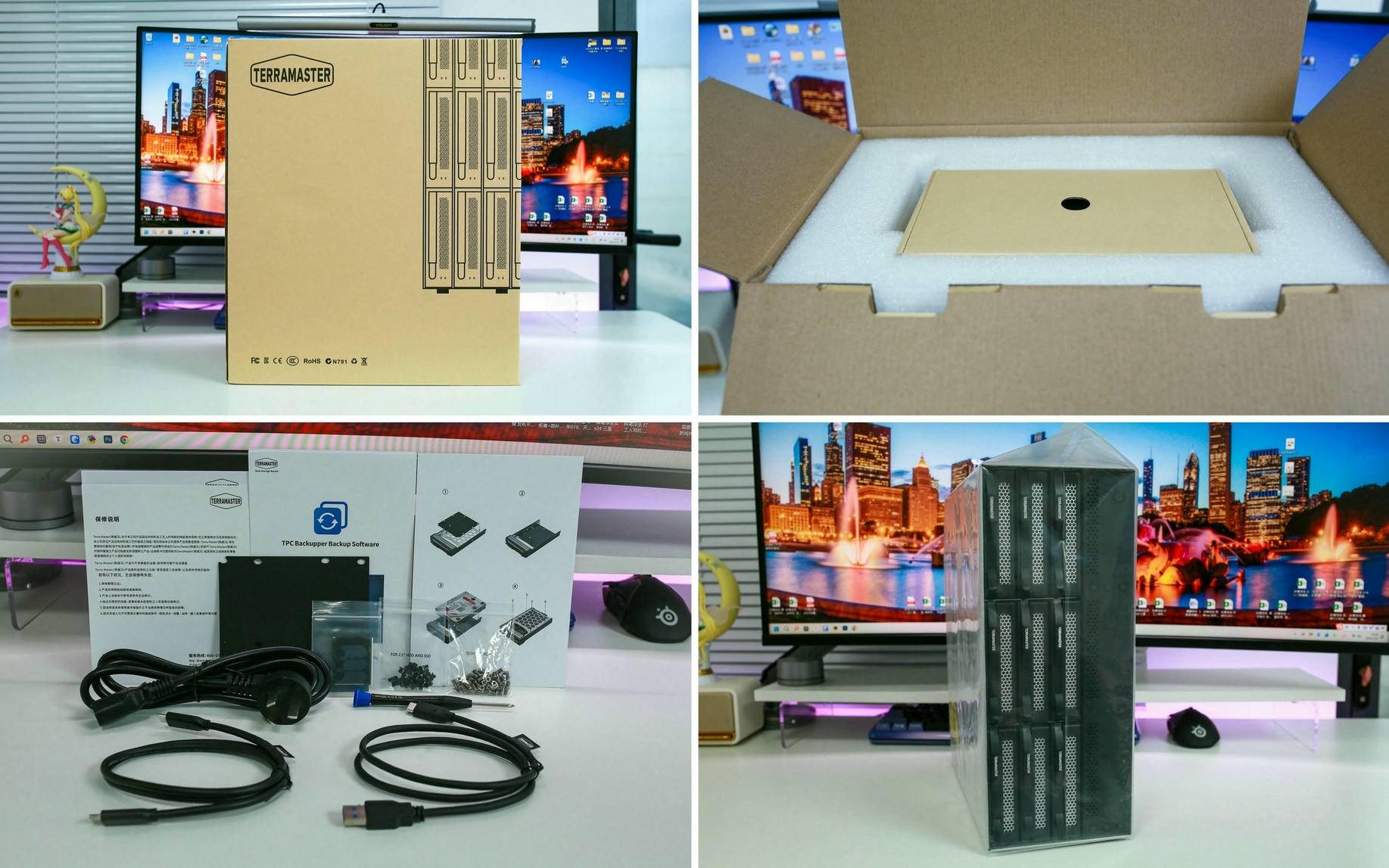 铁威马 D9-320 的整体包装延续了简约实用的风格,采用内外双层牛皮纸箱,虽然外观低调,但材质坚固,能有效保护设备在运输过程中免受撞击损坏。内部使用定制泡沫与缓冲结构精准固定磁盘阵列柜,附件部分也独立分装在专用盒中,排列整齐。