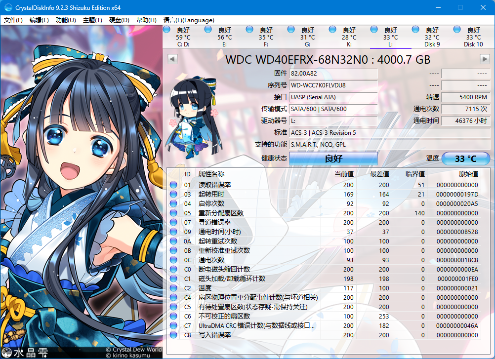 在铁威马 D9-320 阵列柜中测试西部数据的红盘型号 WD40EFRX-68N32N0,容量为 4000.7 GB,固件版本为 CC26,接口识别为 UASP(Serial ATA),符合 ACS-2 和 ACS-3 Revision 3b 协议标准。作为一款专为 NAS 和多盘位环境设计的硬盘,在兼容性和长时间稳定运行方面表现可靠。