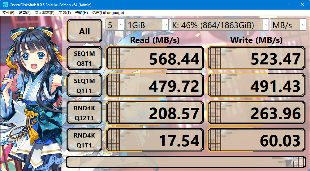 实测读写表现方面,读取速度达到了 568.44MB/s,写入速度为 523.47MB/s,表现符合 SATA3.0 的理论上限,说明在 D9-320 的支持下,这款 SSD 能充分释放性能。对于日常备份、素材存储和大文件传输等需求,已足够应对,兼顾速度与稳定性。