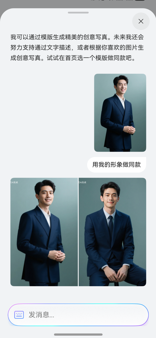在小艺App的智能体市场里,找到了“小艺照相馆Agent”。点进去发现专门有“职业照”分类,有各种背景和服装风格的模板。操作也简单。我找了一张光线均匀、五官清晰的正面生活照上传,再挑了一款干练的藏蓝西装模板,点击生成后,一分多钟就拿到了新职业照。