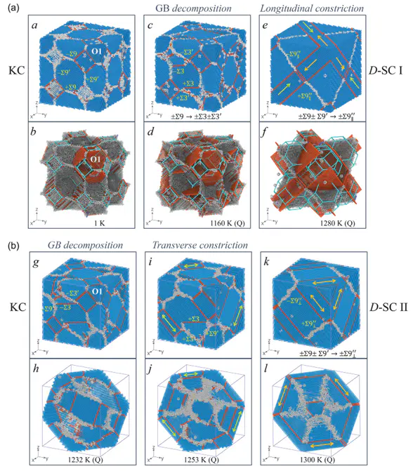 理论计算,特别是分子动力学(MD)模拟,在该研究中扮演了至关重要的角色。它不仅成功复现并验证了实验中观察到的关键现象(如Σ27晶界的振荡演化),更重要的是,它定量计算了不同晶界(如Σ3, Σ9, Σ27)的能量,精确揭示了高能晶界(如Σ9, Σ27)不稳定的本质。