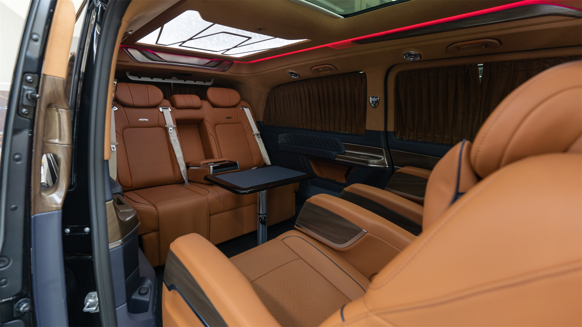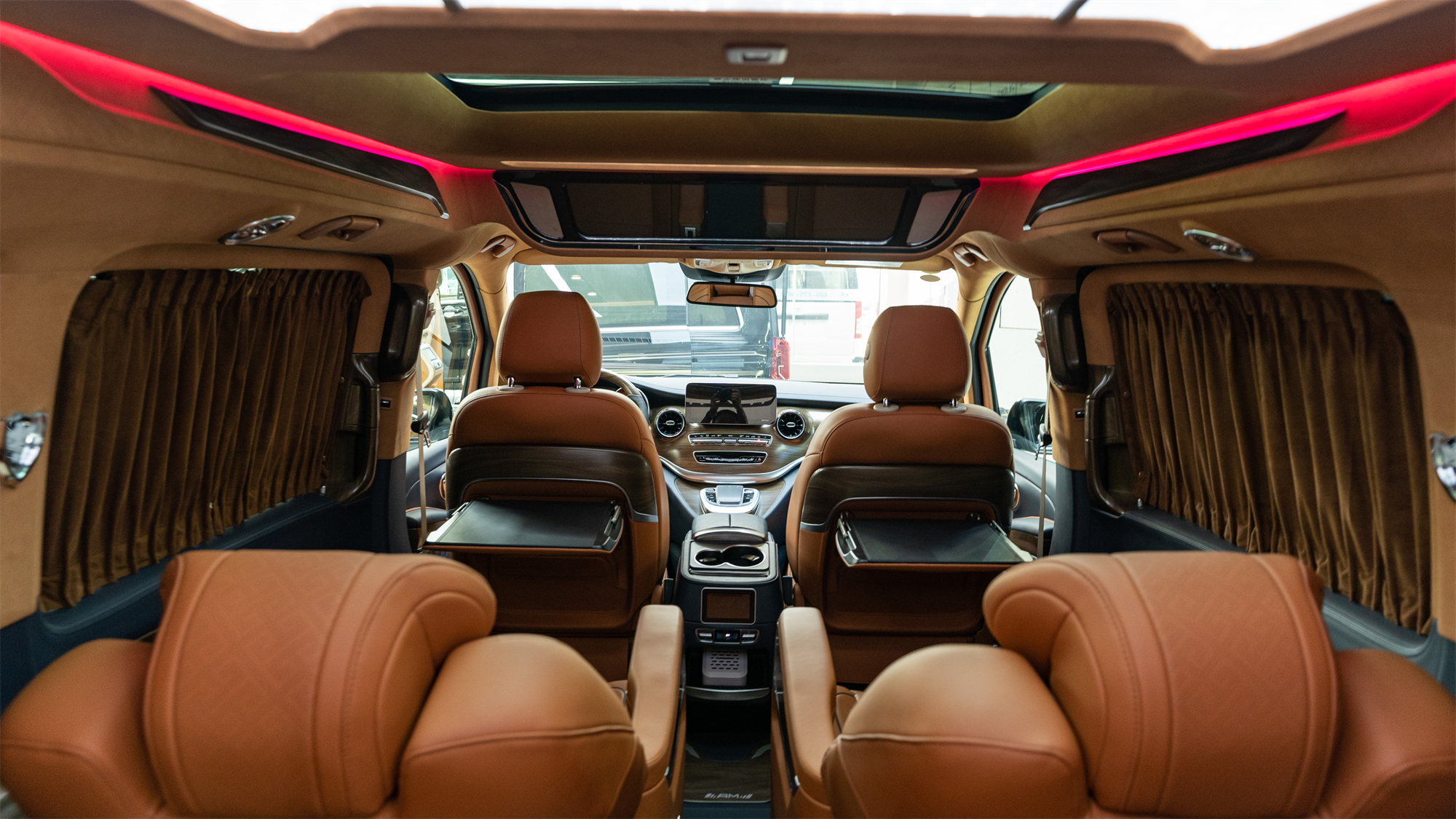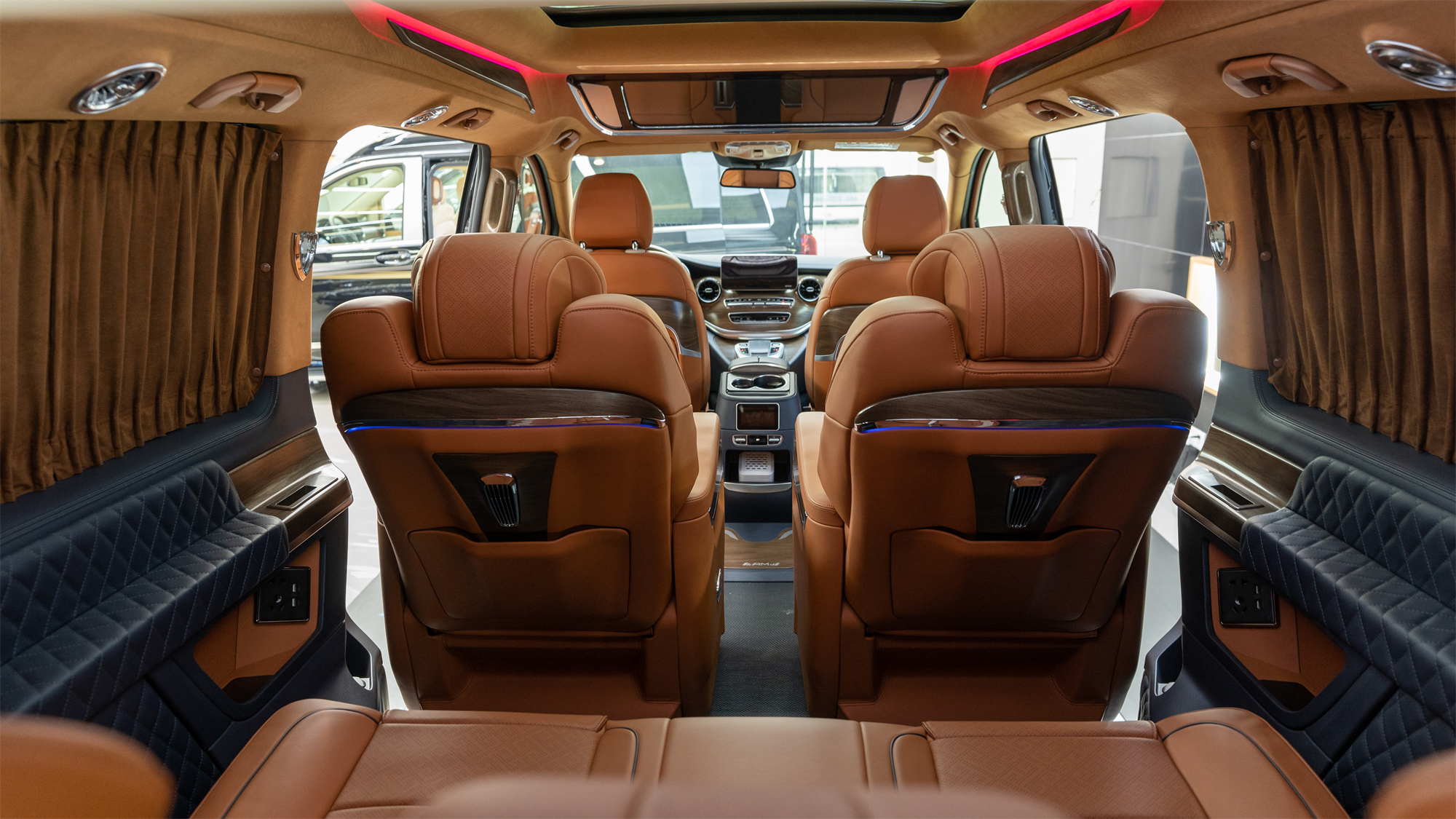 其他配置方面,奔驰V260L顶棚加装了顶灯,氛围灯多色可调节,以及私密窗帘、横屏电视、柏林之声音响、电源插座及USB接口、恒温杯托、液晶控制屏等等,给出行带来更多的便捷。