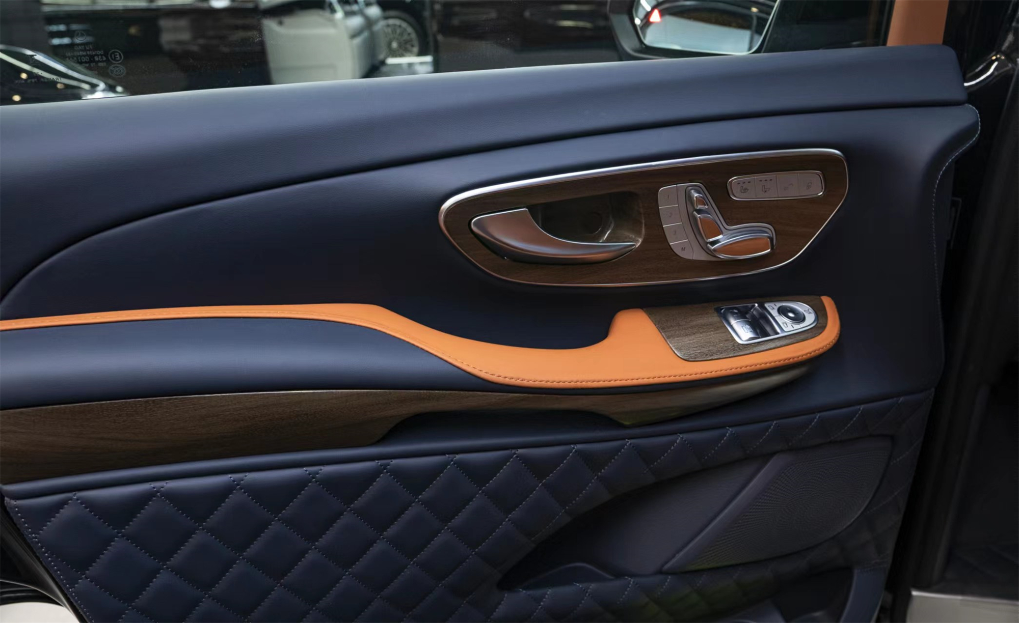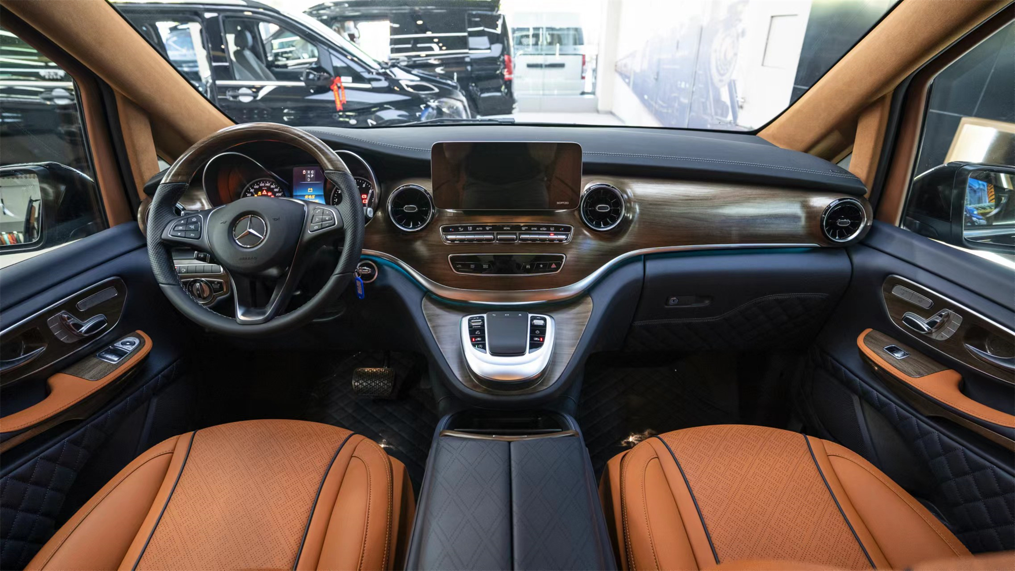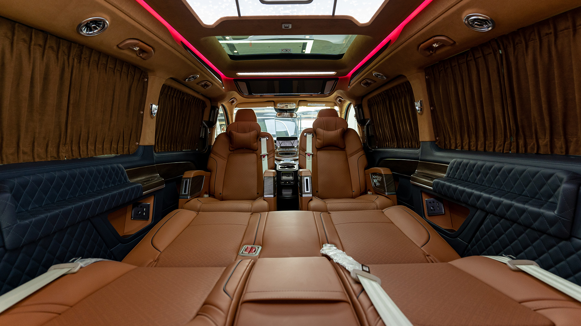 打开车门,新车采用棕色与深宝蓝色的搭配,配车岑木以及真皮,非常有豪华质感。中排扶手还升级扶手箱带冰箱设计,多功能方向盘,以及四轮空气悬挂,拥有着全新的驾乘体验。