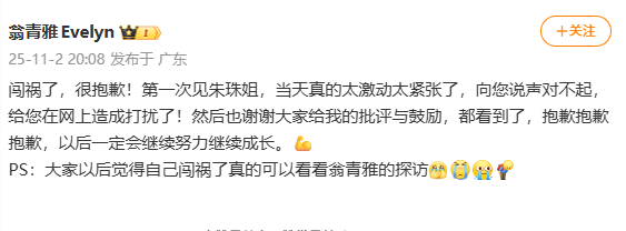 翁青雅的提问全程卡顿、忘词,甚至连品牌名都念不清楚。一句 “您今天穿得好看吗” 重复四次,且多次卡顿,逻辑混乱到需要工作人员紧急救场,事后翁青雅也发了微博表示歉意