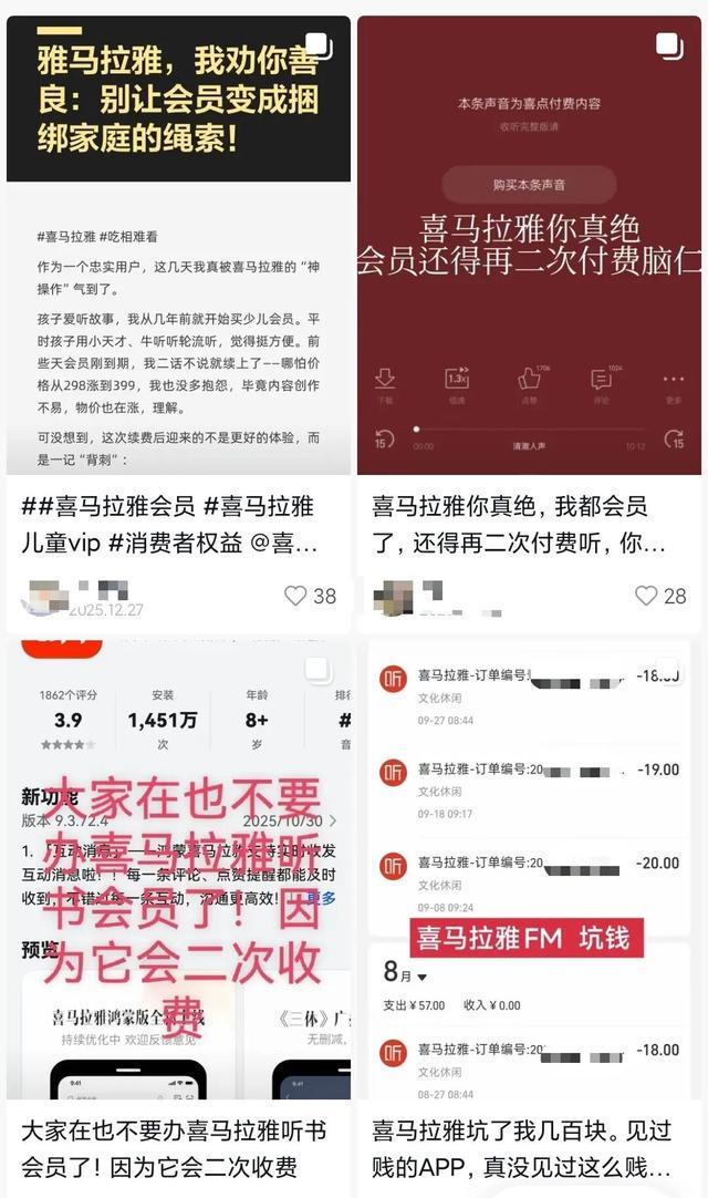记者在各社交媒体上搜索“喜马拉雅会员”,发现不少用户都有类似的不满。网友@虎柴柴曾于2025年12月27日发文称,自家有两个孩子,她已购买了喜马拉雅少儿会员,此前两个孩子能共用会员。但自从当年12月更新后,会员费用从289元涨到399元,两个孩子的两个手表也必须一人开一个会员,这让她难以接受。