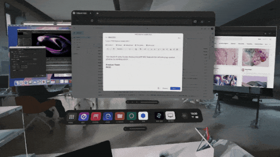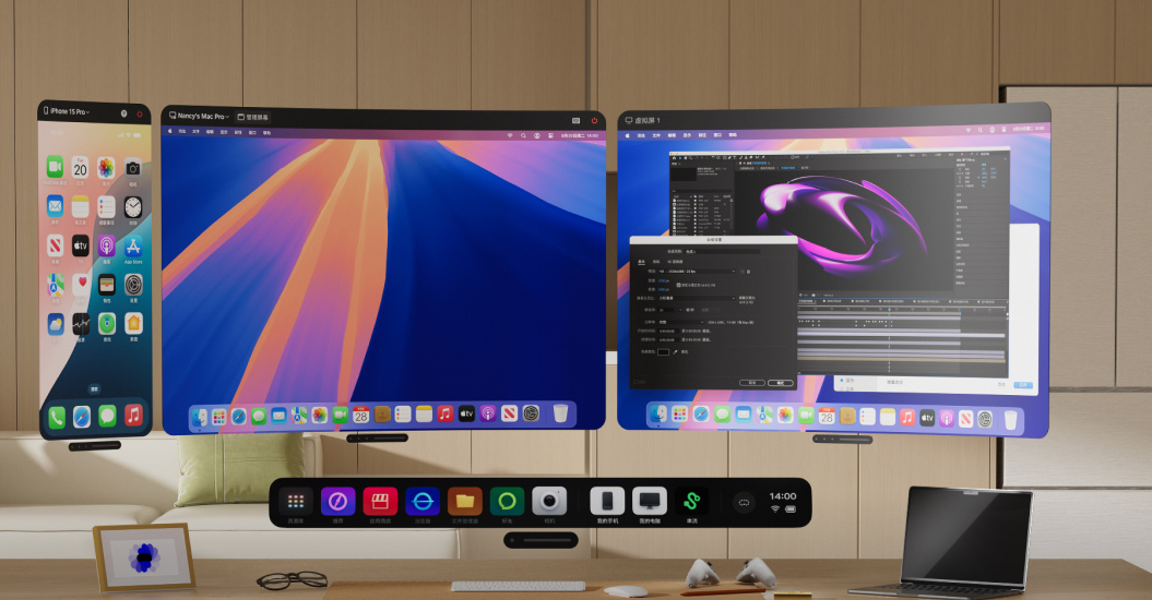 在虚拟空间中,您可以自由调整每个投屏窗口的尺寸比例,从传统的16:9到超宽的32:9带鱼屏模式随心切换,更支持创新的环形排列布局,让多个屏幕自然环绕在视野范围内。独特的"智能聚焦"技术会自动优化您正在交互的窗口画质,确保关键内容始终保持4K级清晰度,而余光区域的窗口则智能降低功耗。