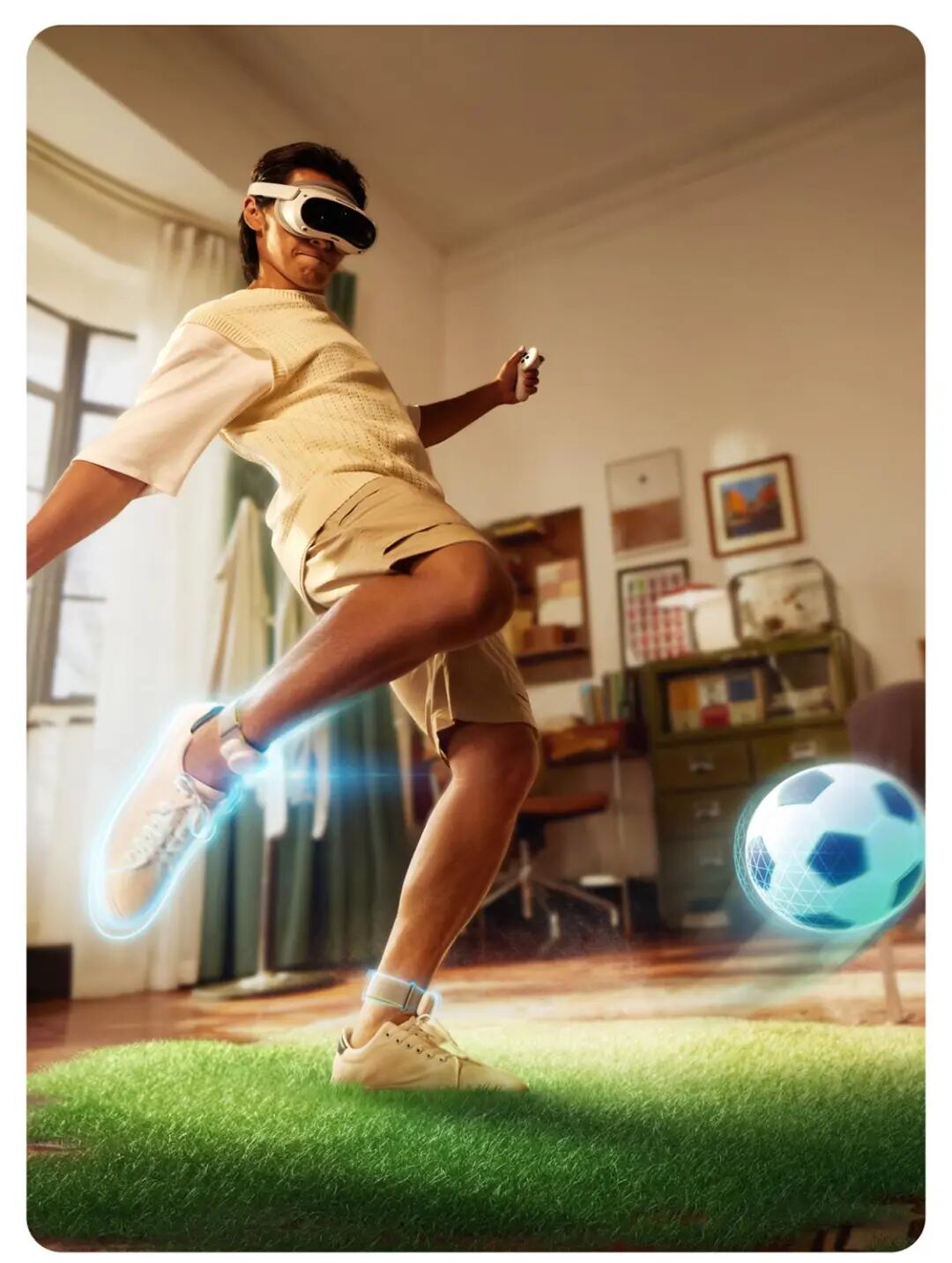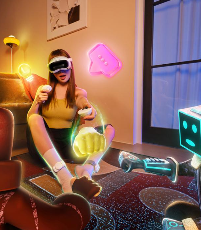 PICO 4 Ultra搭载的自研环境感知算法,开创性地实现了数字与现实的无缝融合。在混合现实模式下,虚拟物体不再简单地"漂浮"在现实空间,而是能够智能地适应环境——数字摆件会自然地"放置"在桌面上,虚拟角色可以巧妙地绕过现实障碍物,光影变化会随真实光源方向自动调整。