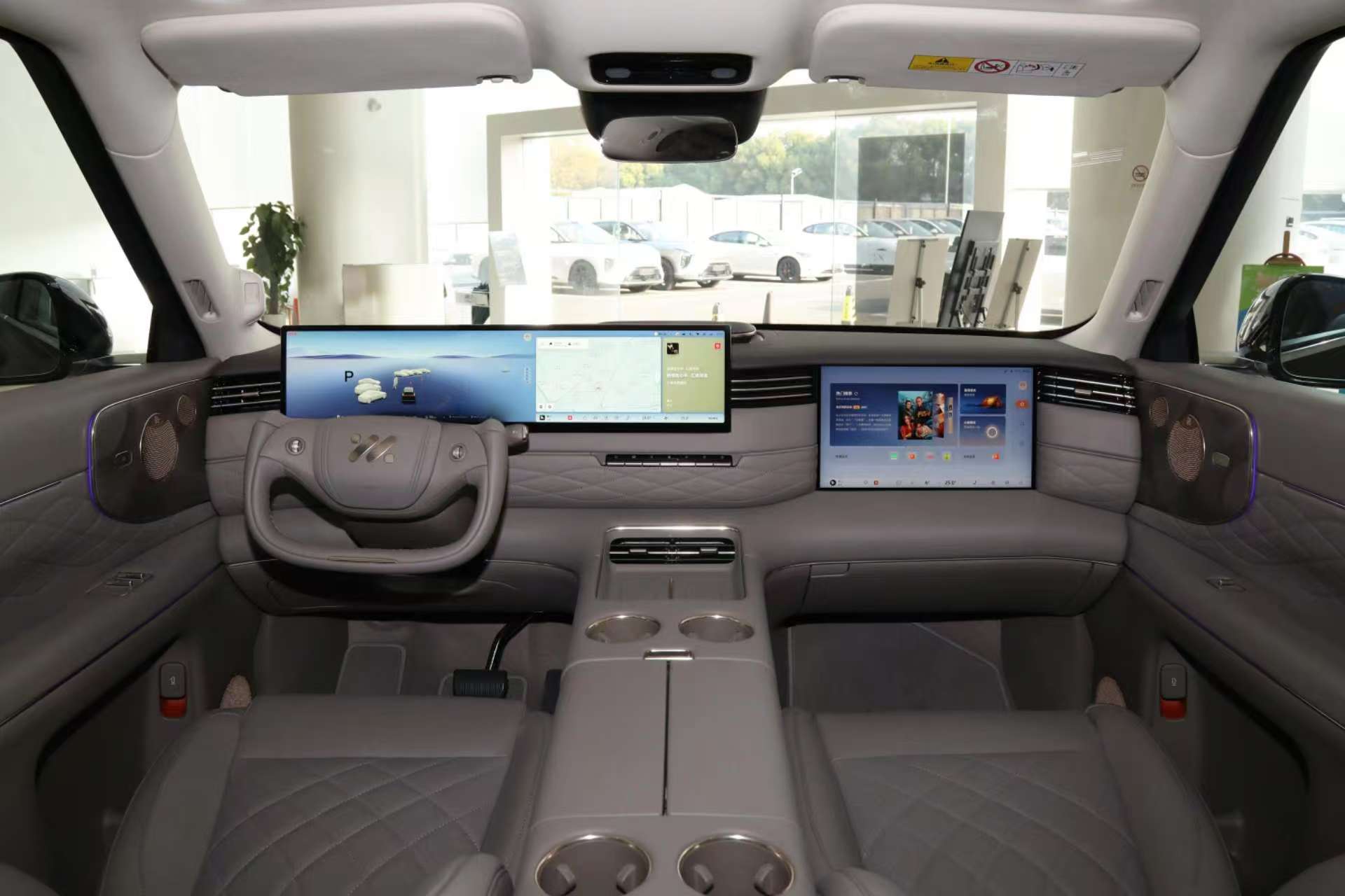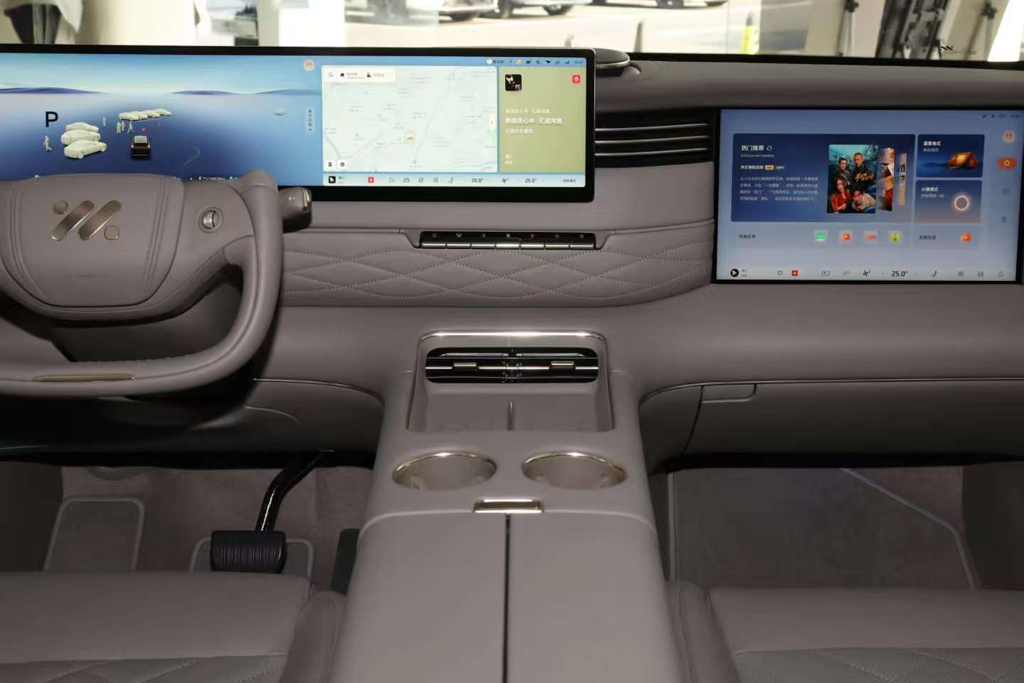 内饰的大屏设计绝对是智己 LS9 的 “吸睛点”,第一次坐进车里的人,都会被它的屏幕布局惊艳到。它取消了传统的单屏分置设计,用一块 27.1 英寸的中控屏从驾驶位一直延伸到车辆中部,视觉冲击力特别强。而且副驾还专门配了一块 15.6 英寸的娱乐屏幕,加上标配的抬头显示,相当于车内有 “四屏” 联动,能给驾乘人员提供多维度的信息展示。比如开车的时候,抬头显示会把车速、导航等关键信息投射到前挡风玻璃上,不用低头看仪表盘,更安全;副驾乘客可以在娱乐屏幕上看电影、刷视频,打发长途时间。更贴心的是,这套大屏系统还支持手机互联映射,把手机里的视频投射到大屏上,观影效果堪比小型影院,一家人返乡路上再也不会觉得无聊了。