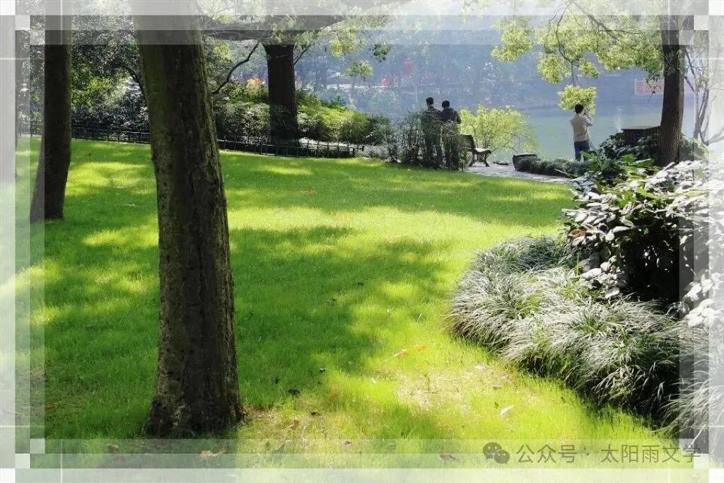 湖中水草清晰可见,愈发使湖水明澈灵动。湖水荡漾,轻轻拍打着岸边的青石,发出阵阵有节奏的声响,仿佛来自远古的乐音,又如湖水声声低吟。从湖水中不时飘散出的淡淡水草味,犹如嗅到了西湖生命的远古暗香。此时,一对老夫妻相携走过,看我一直徘徊于湖岸,似乎有些好奇,但还是报以友好的微笑。