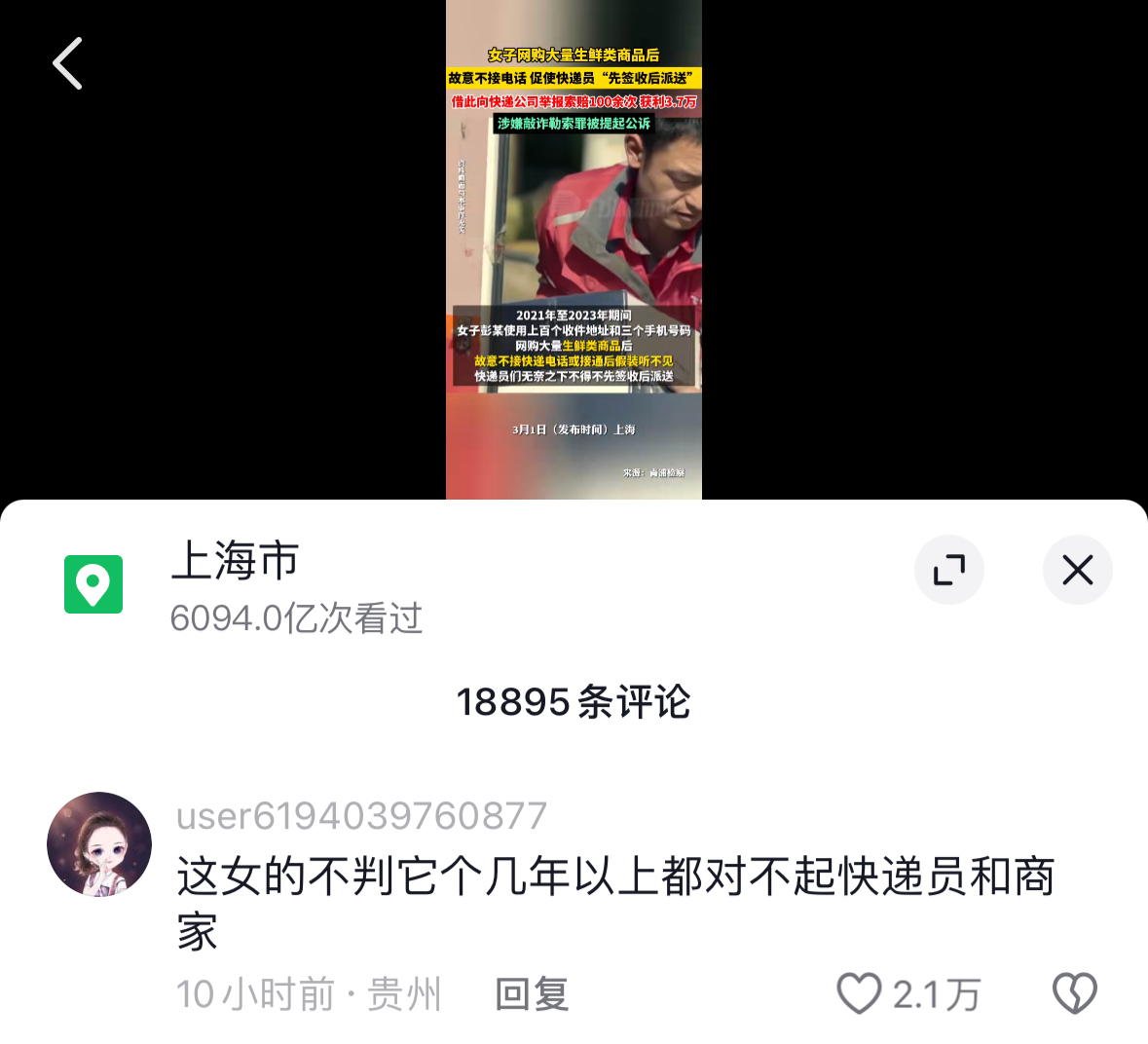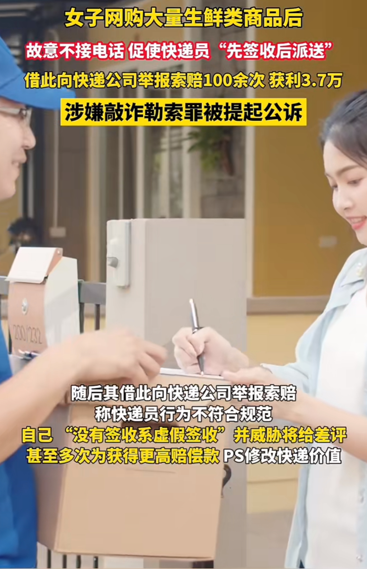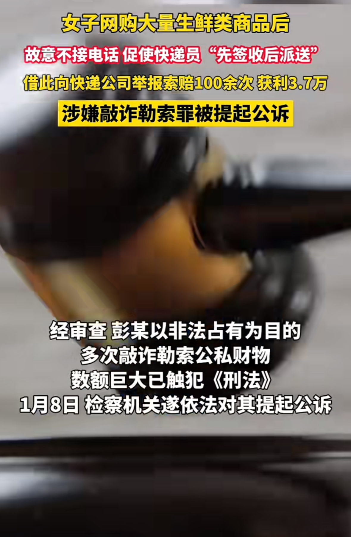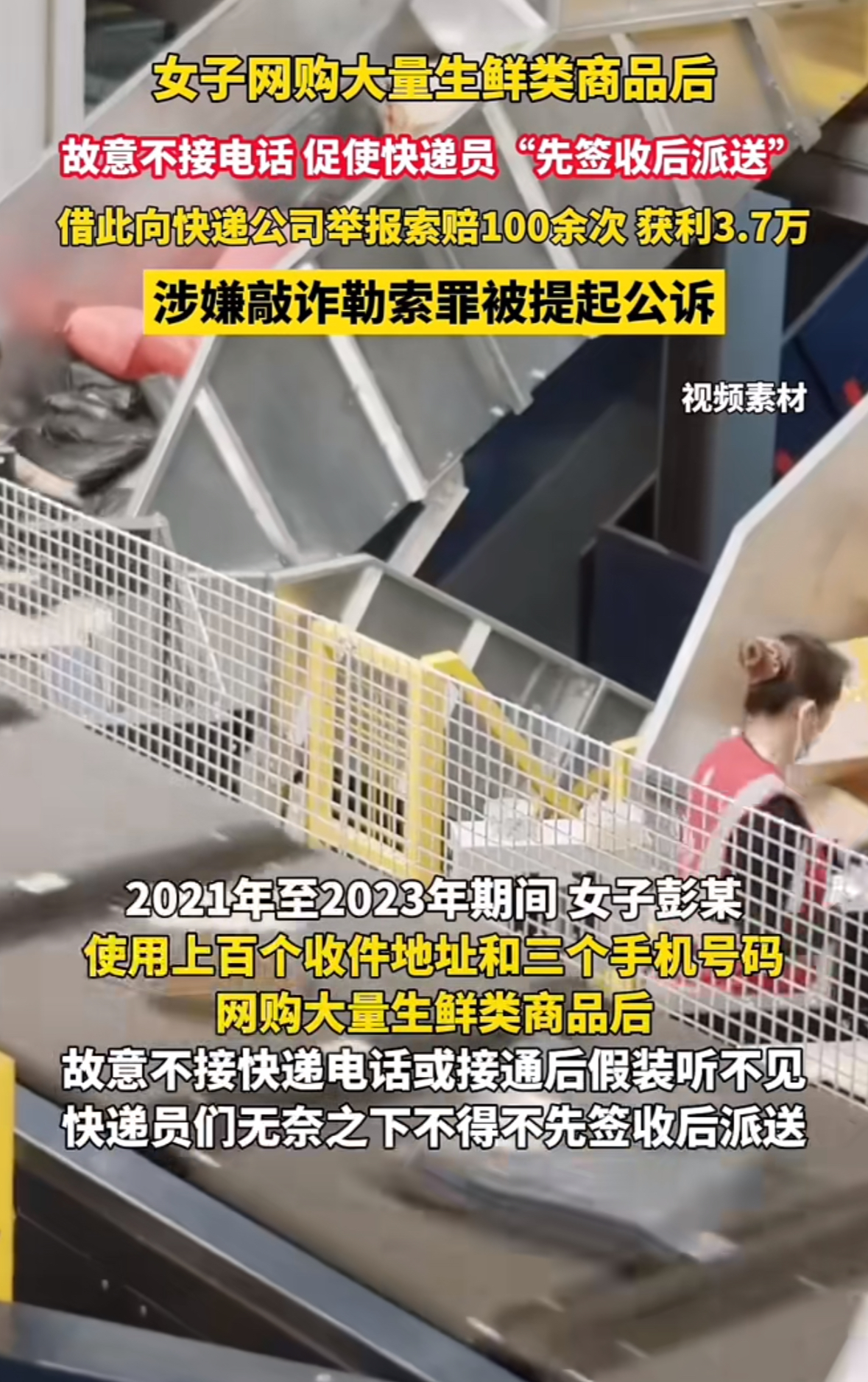 某微信公众号最近报道了这么一则新闻:一彭姓女子在2021年至2023年期间,以投诉索赔为目的,网购大量的生鲜类商品后,故意不接快递电话或者接听后假装听不见,促使快递员先签收后派送,随后其借此举报,向快递公司索赔100余次,非法获利37000元。