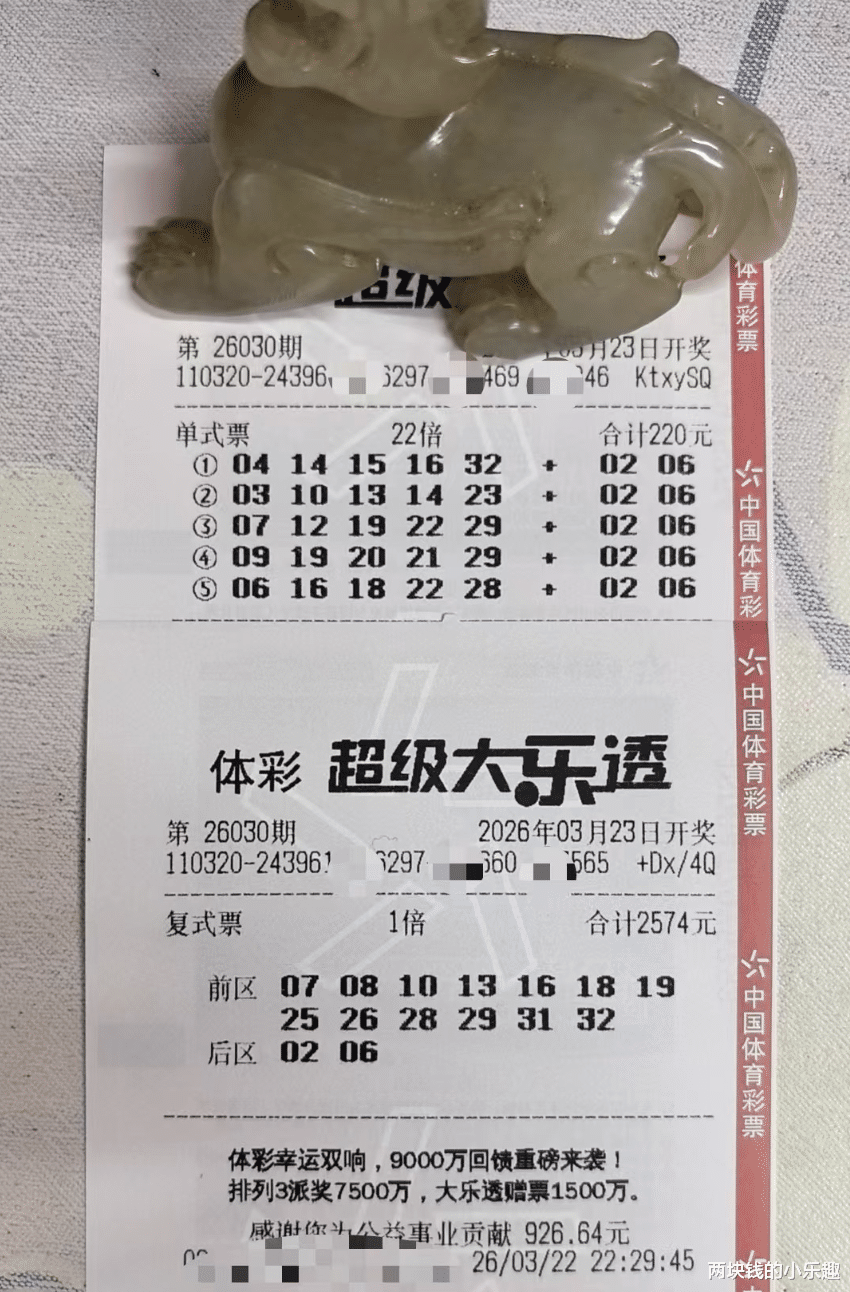 大家好,下面给大家带来了体彩大乐透第26030期的赏析,本期为大家整理了较早一波精彩内容的汇总,江苏99倍哥自然是本期内容的领队,一张22倍单式票和一张2574复式领衔全场,另有4752复式拆分和降级后的2张1584复式一同亮相,下面请大家开始欣赏: