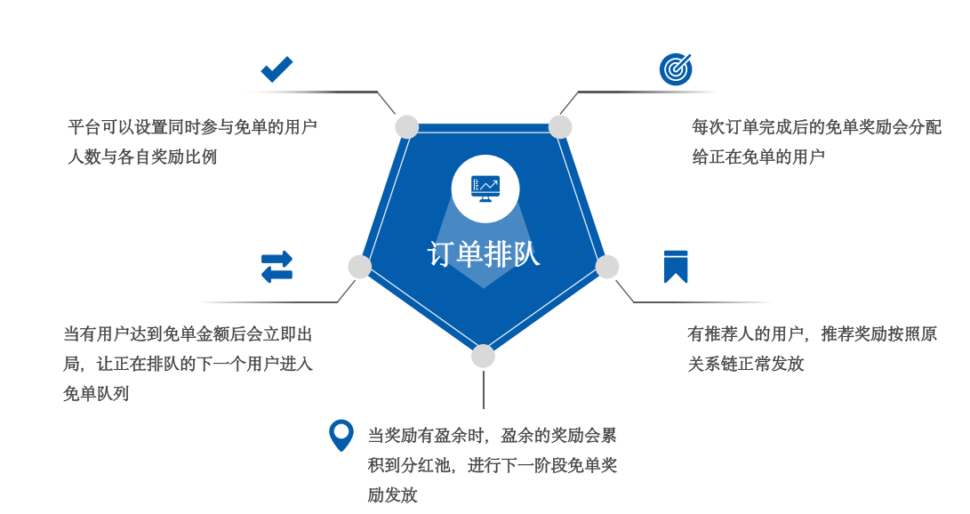 平台可灵活设置同时参与分红的队列人数(例如3人、5人)、以及每笔订单划入奖励池的比例(例如20%、40%)。