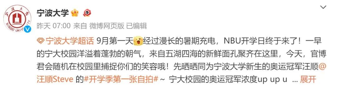 关键这家伙不光长得帅,学历也是杠杠的牛啊!2023年9月1日,宁波大学还发布了一条微博,声称奥运冠军汪顺前来报到!