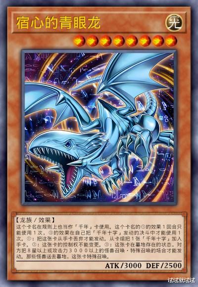 寄宿心灵的蓝眼龙,该卡视为千年卡,一效果手牌舍弃卡组检索千年十字该效果在发动过千年十字的决斗中只能使用一次。二效果控制权不能变更。三效果墓地存在时对手特殊召唤8星以上怪兽或者3000攻击以上怪兽,把该怪兽送墓之后特殊召唤此卡。