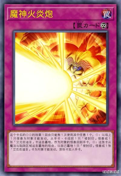 愤怒的业火 艾克佐迪亚火焰炮,该卡视为魔神火,其效果一场上有老艾时对方场上卡全部破坏。二效果墓地的该卡除外选择老艾组件加入手牌或者返回墓地除外区的老艾组件,该效果送入墓地的回合不能发动。