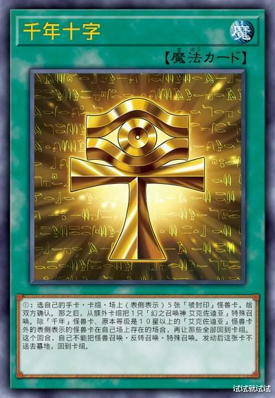 千年十字,其卡图也为千年神器中的十字架,其效果是展示墓地黑暗大法师组件之后融合召唤,幻之召唤神,并且把组件场上除千年卡以外的怪兽卡返回卡组,发动后该回合不能特招、通召和反转召唤,而且该卡发动后不送墓而是返回卡组。
