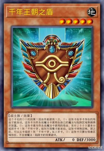 千年王朝之盾,一效果可以当永续魔法卡放置。二效果2000生命值或者展示千年十字特殊召唤,之后检索一张千年十字。三效果该卡在怪兽区不会被魔陷效果破坏。
